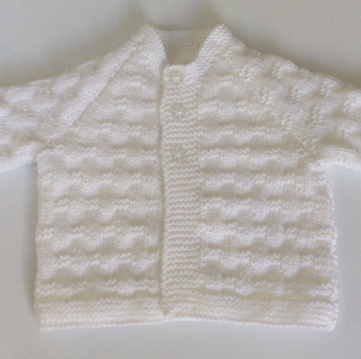 Gorgeous white baby jacket hand knitted by me in my smoke and pet free Suffolk home. The yarn I’ve used to knit this traditional vintage style cardigan is lovely and soft and won’t irritate a baby’s delicate skin. Fastens with three baby buttons. Buttons may vary slightly from those shown, but will always be white baby buttons.