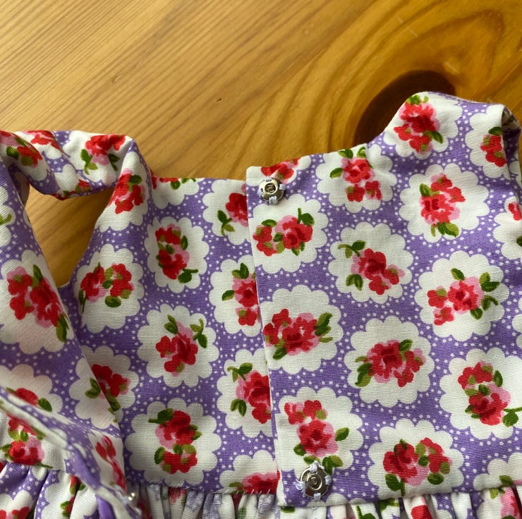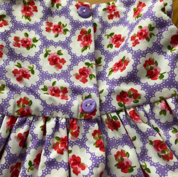 Dolls dress is a very pretty lilac and red floral print. The bodice is lined, the skirt has two ruffles.
