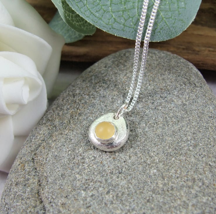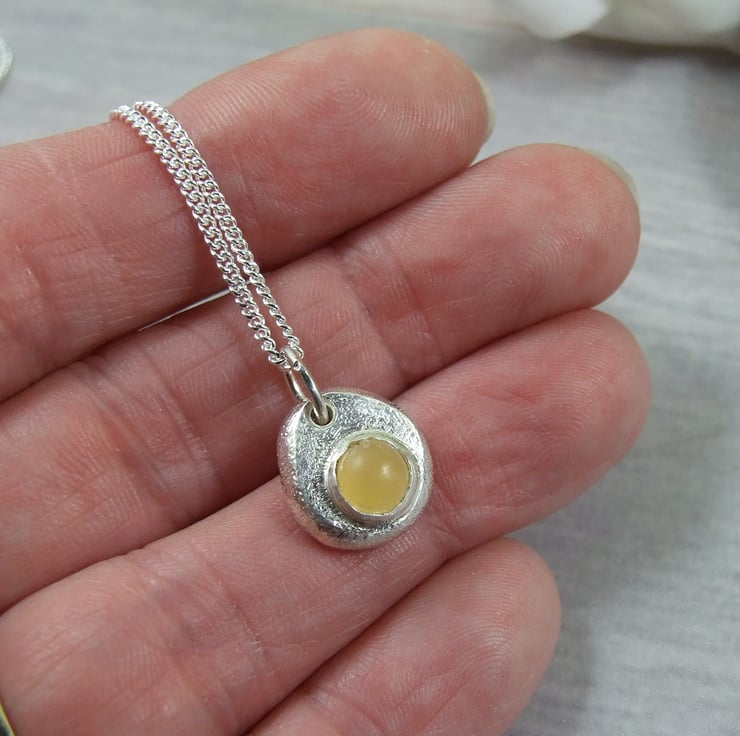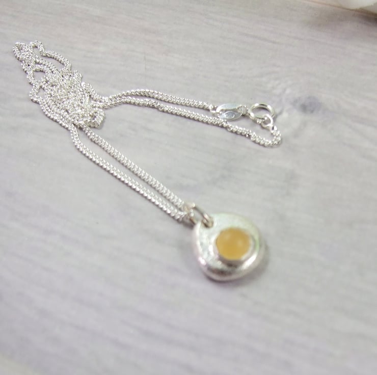 I have created the pendant from recycled silver heated to melting point then left to cool and slightly flattened. To this I have added a silver decorative bezel in which I have set a 6mm Yellow Aventurine Cabachon and fitted to sterling silver 18 inch chain (16 inch chain available if preferred).