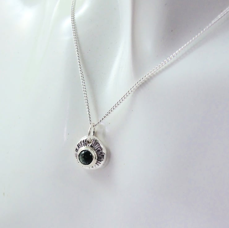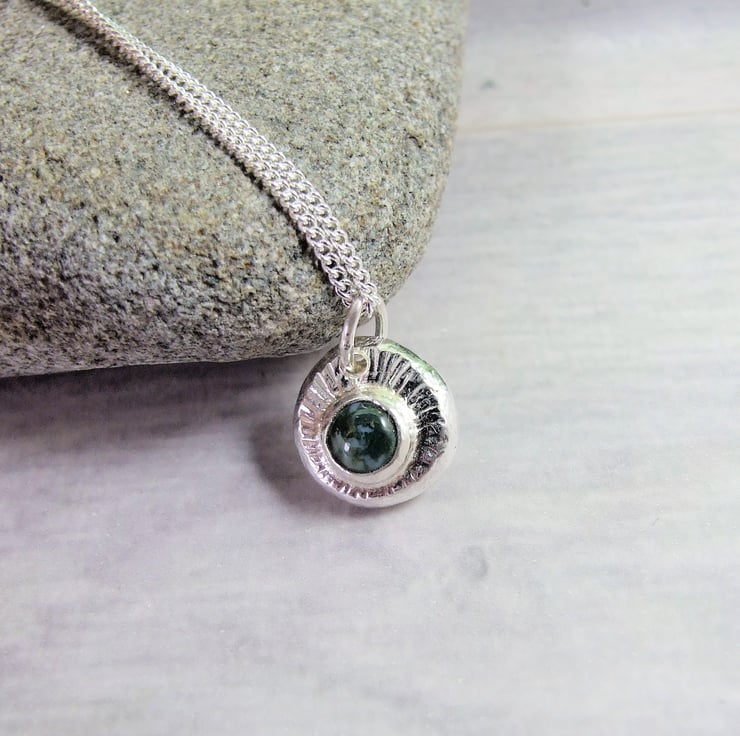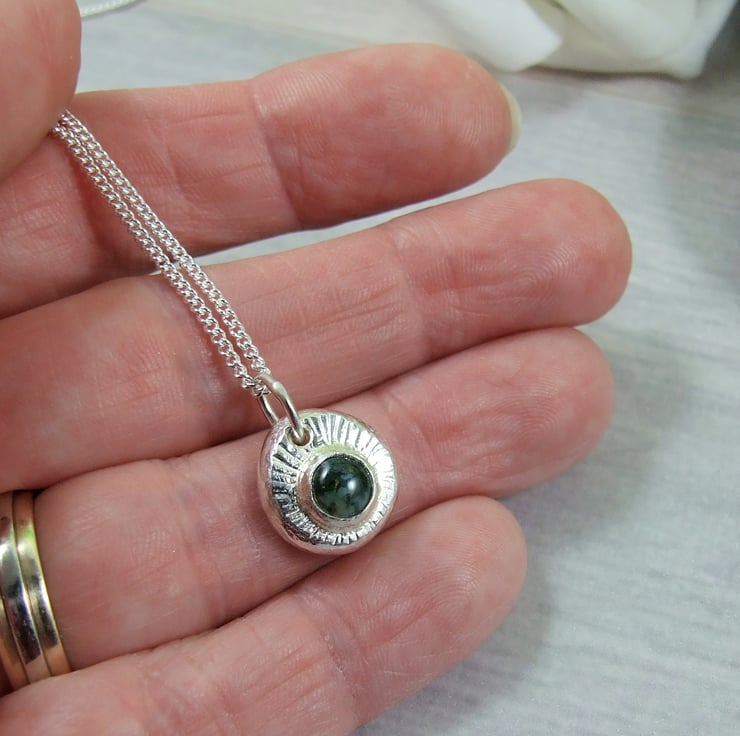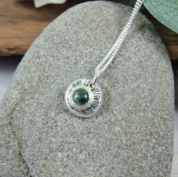 I have created the pendant from recycled silver heated to melting point then left to cool and slightly flattened. To this I have added a silver decorative bezel in which I have set a 6mm Moss Agate Cabachon and fitted to sterling silver 18 inch chain (16 inch chain available if preferred).