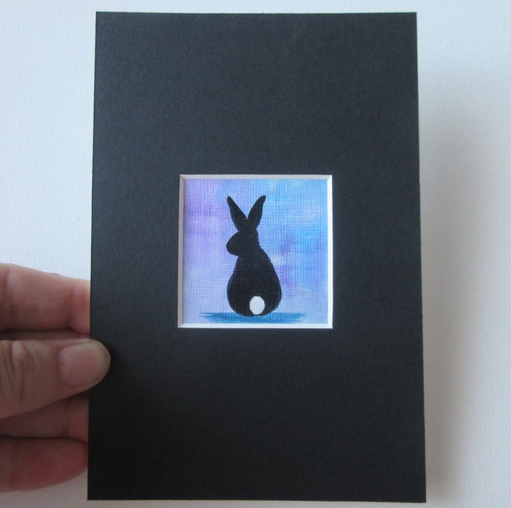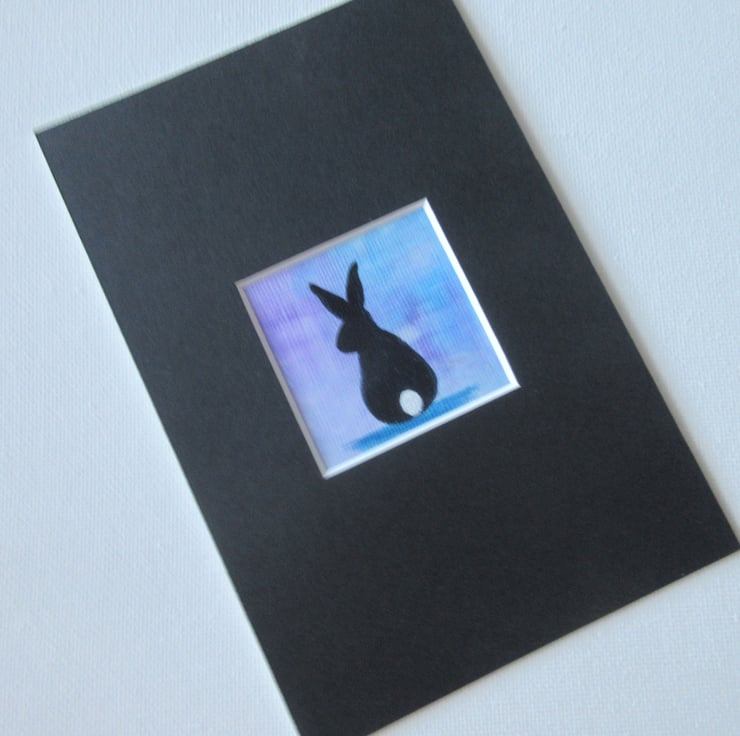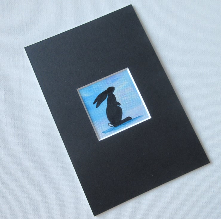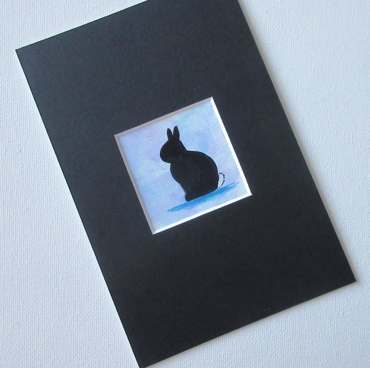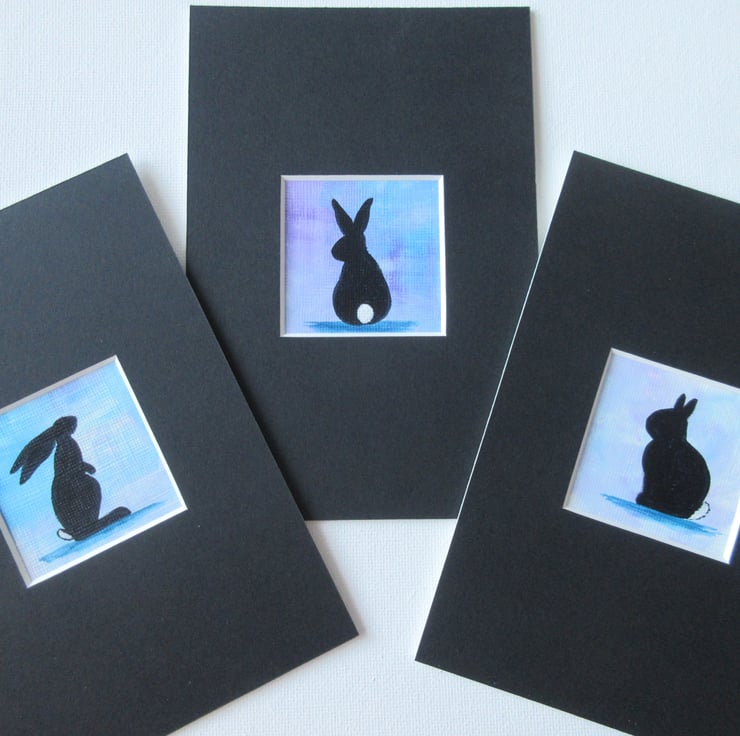 The paintings are of black rabbits against backgrounds in shades of blue. The mounts are black, and ready to fit into standard 4" x 6" frames.