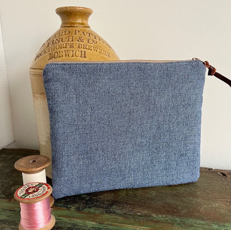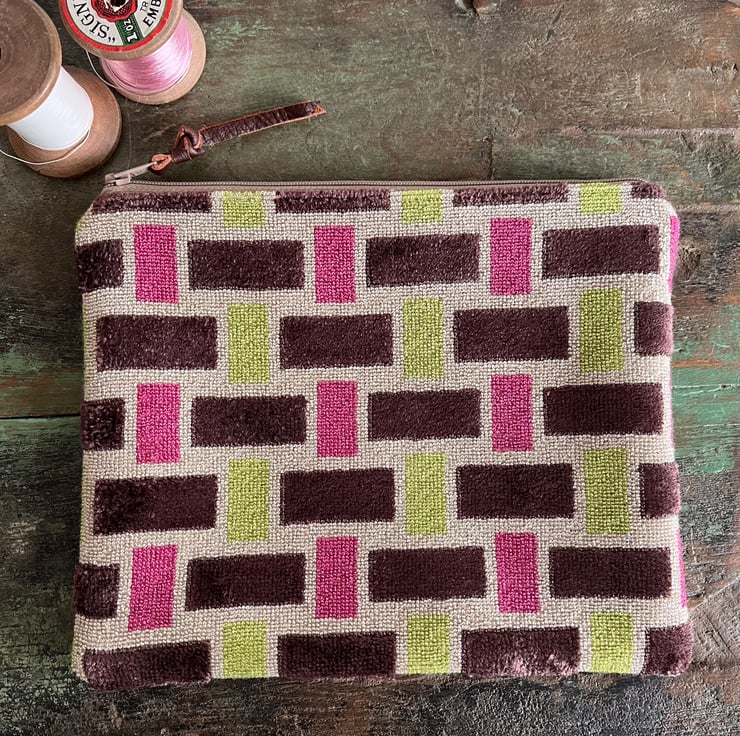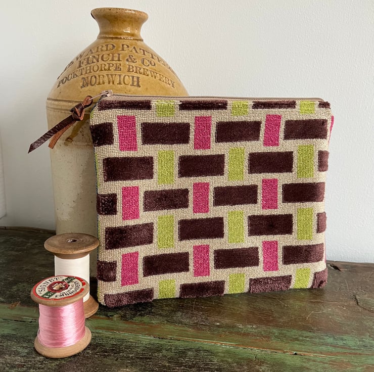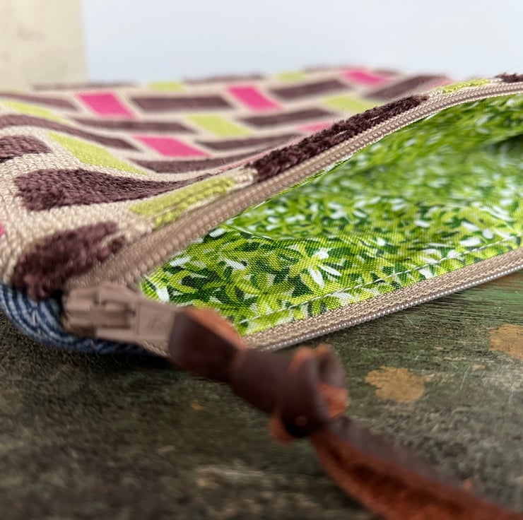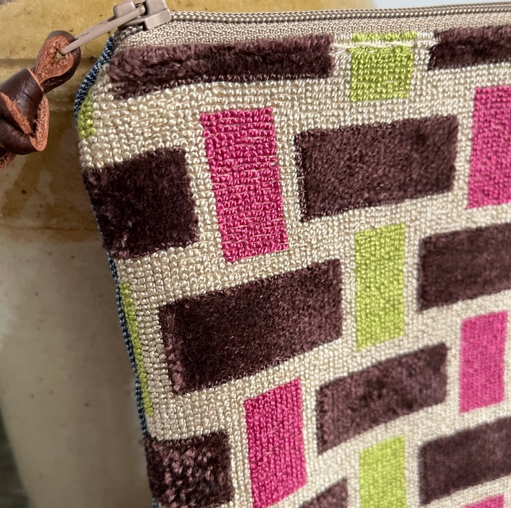 One of a kind zip pouch made from a sample of osbourne and little furnishing fabric with a raised texture and pattern of colourful rectangles on a beige background. The pouch is backed with reclaimed denim from old jeans and lined with pretty cotton.
