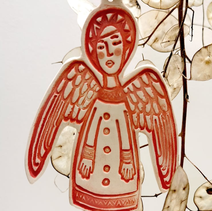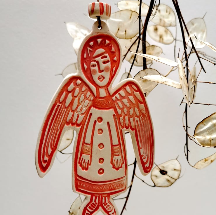 A handmade ceramic Angel hanging decoration, perfect for adding a seasonal accent to your home, or for all year round decoration.