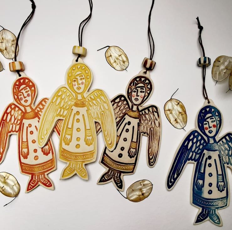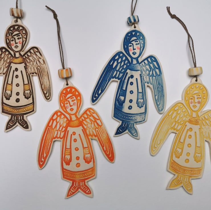 Each angel is handmade from white earthenware clay and glazed using underglaze colours. The cheeks have an additional application of transparent glaze to add a little shine! Each angel has its own matching glazed bead and the whole ornament is strung on hemp or linen cord according to availability. Currently handmade to order, so will vary slightly from the listing image-consequently each one is unique!