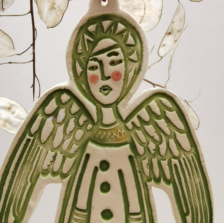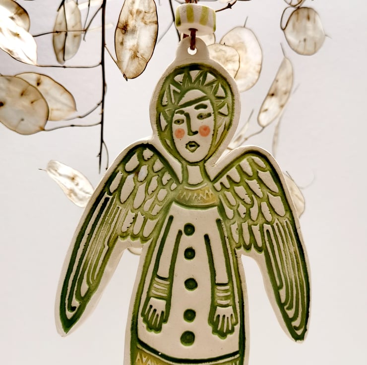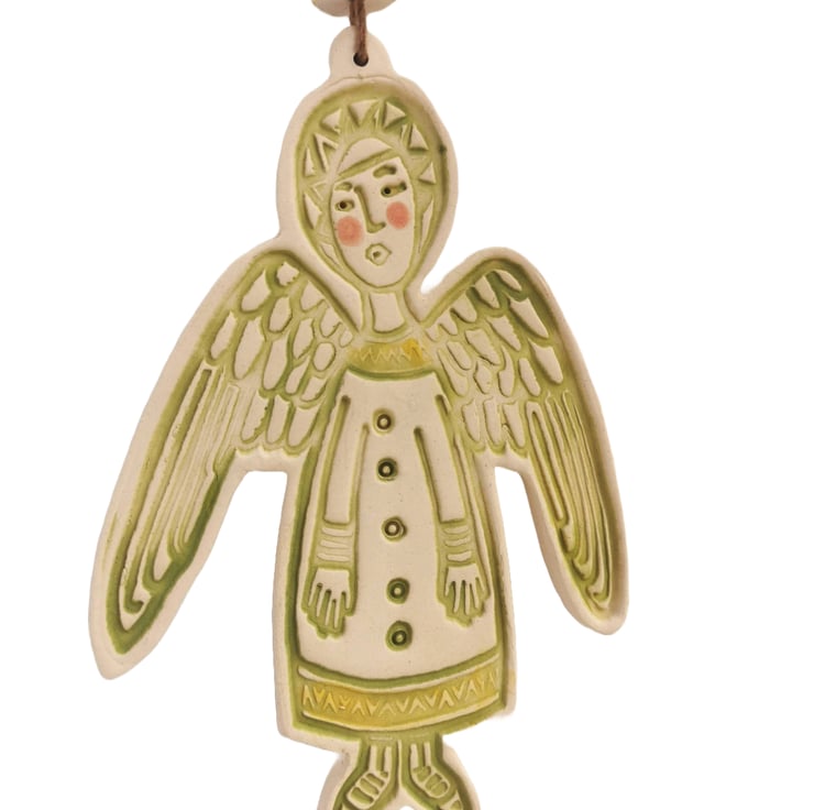 A handmade ceramic Angel hanging decoration, perfect for adding a seasonal accent to your home, or for all year round decoration.