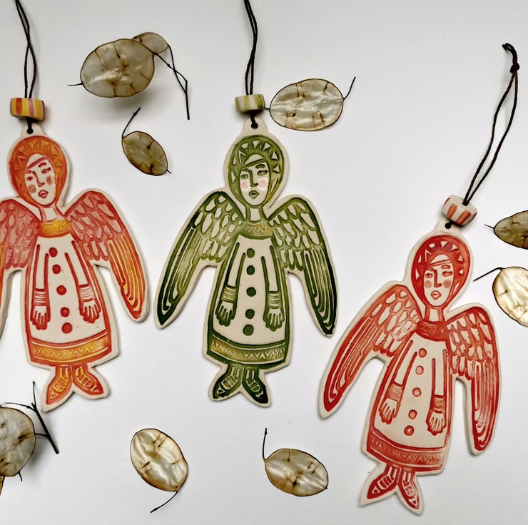 Each angel is handmade from white earthenware clay and glazed using underglaze colours. The cheeks have an additional application of transparent glaze to add a little shine! Each angel has its own matching glazed bead and the whole ornament is strung on hemp or linen cord according to availability. Currently handmade to order, so will vary slightly from the listing image-consequently each one is unique!