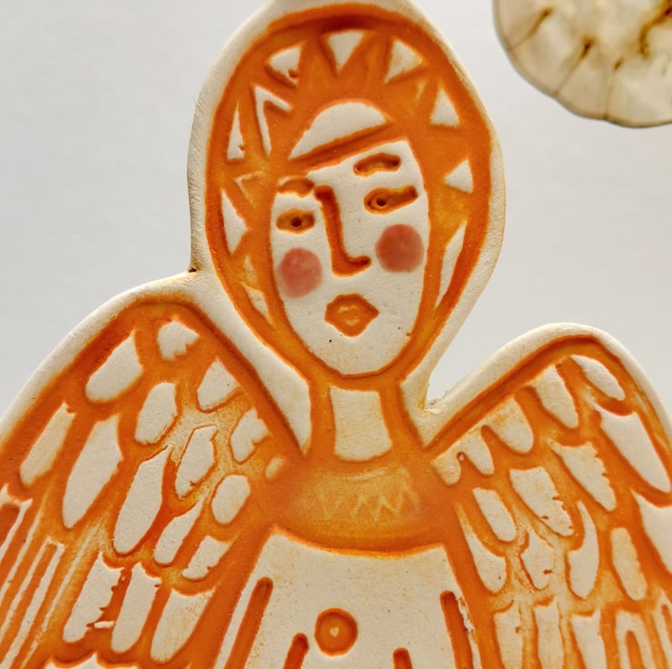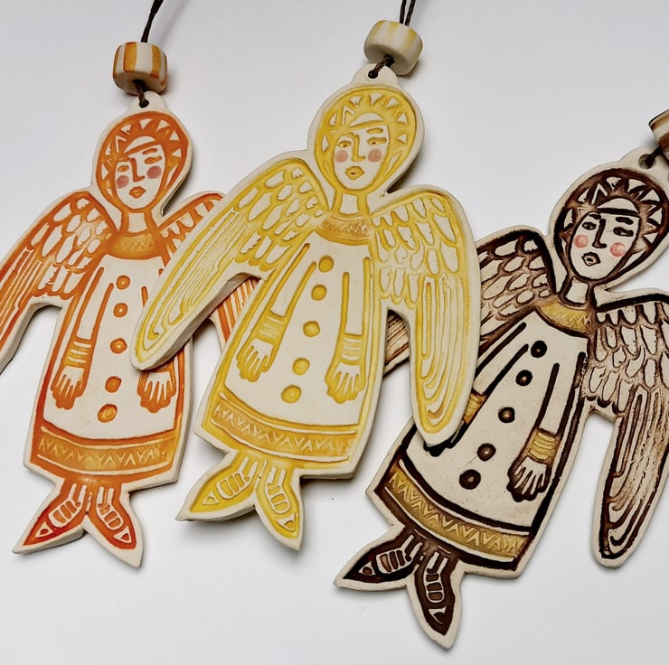 Each angel is handmade from white earthenware clay and glazed using underglaze colours. The cheeks have an additional application of transparent glaze to add a little shine! Each angel has its own matching glazed bead and the whole ornament is strung on hemp or linen cord according to availability. Currently handmade to order, so will vary slightly from the listing image-consequently each one is unique!