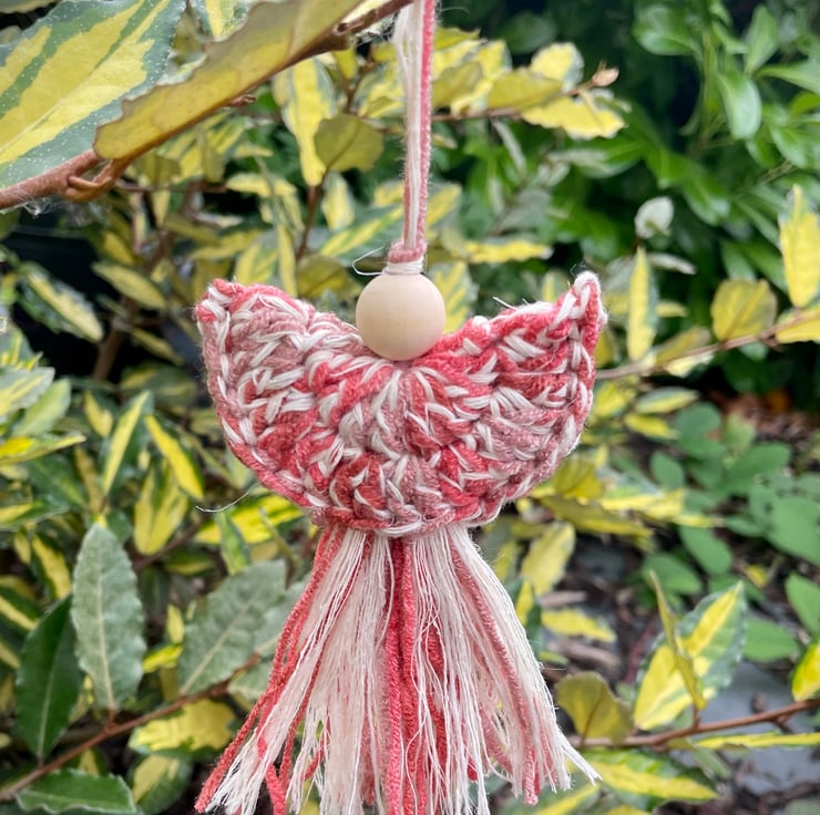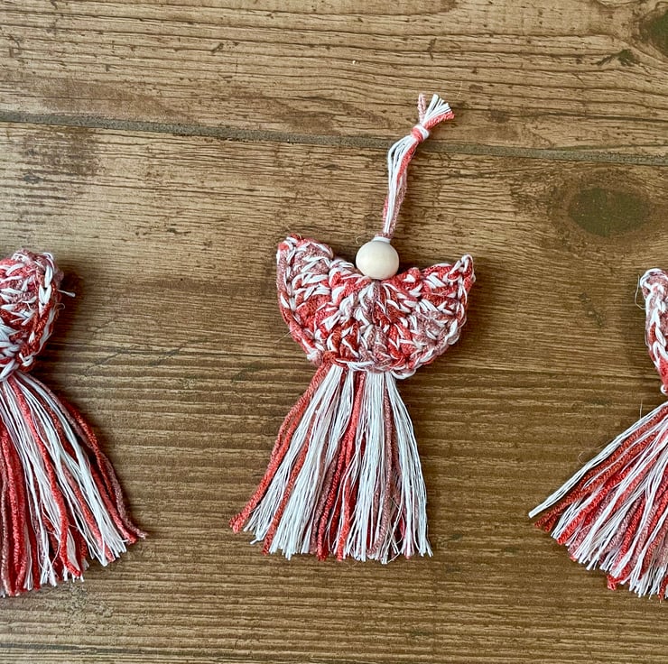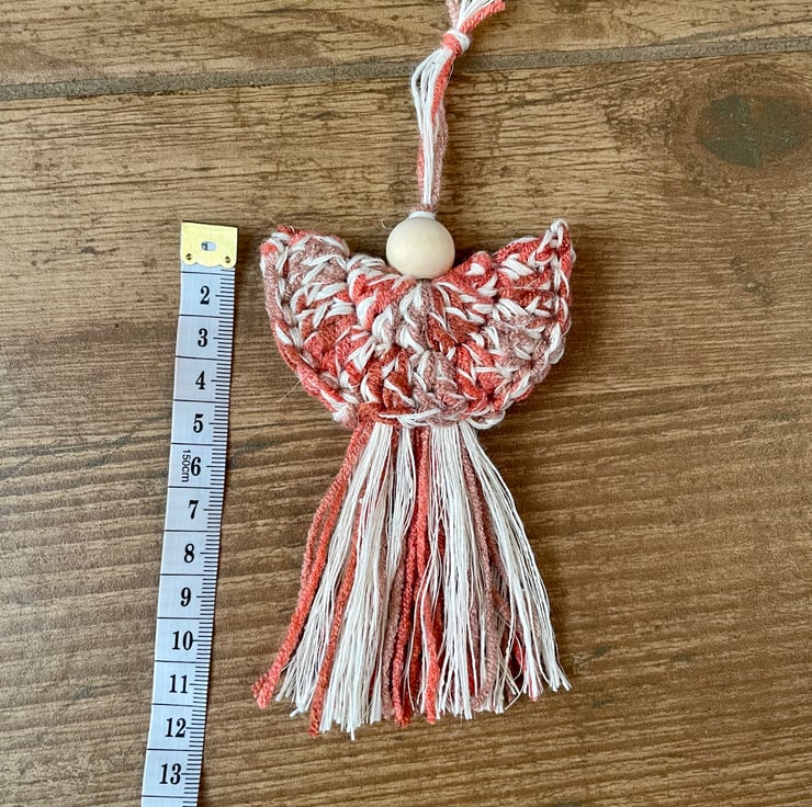 Each angel is handcrafted in cotton and acrylic yarn with a wooden bead and measures approximately 6 cm x 11 cm.
