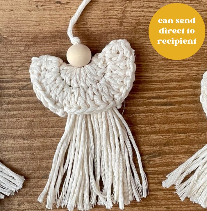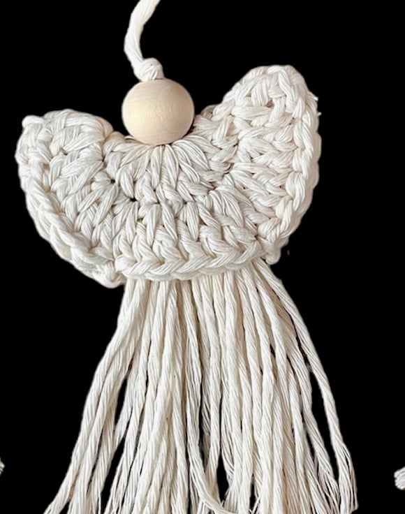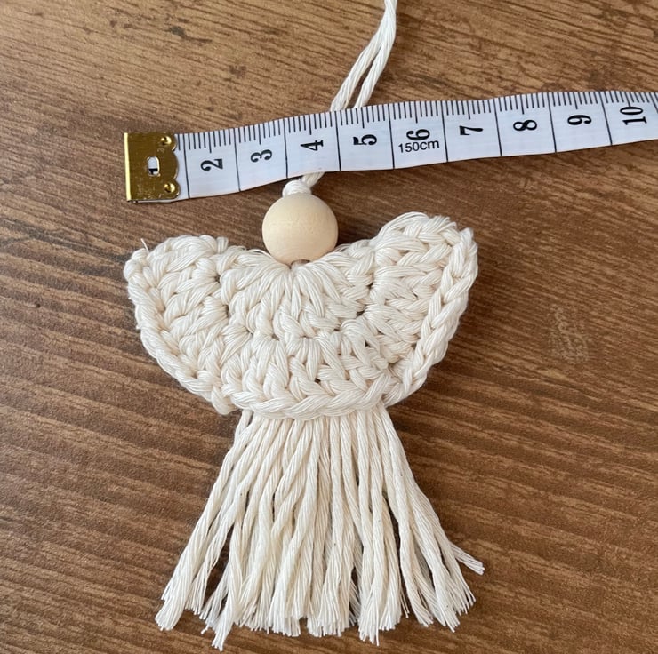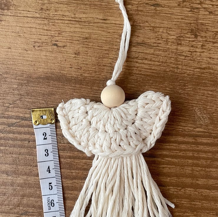 Each angel is handcrafted in cotton yarn and a wooden bead and measures approximately 6 cm x 11 cm.