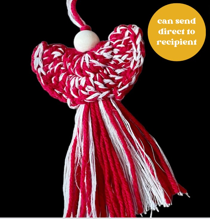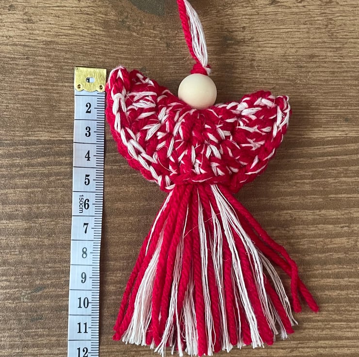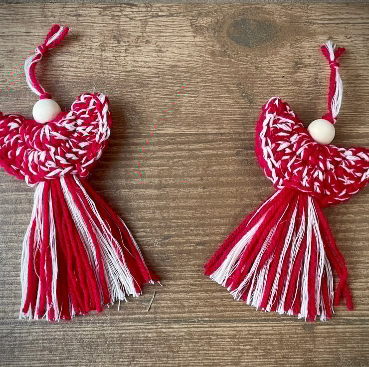Each angel is handcrafted in cotton and acrylic yarn with a wooden bead and measures approximately 6 cm x 11 cm.