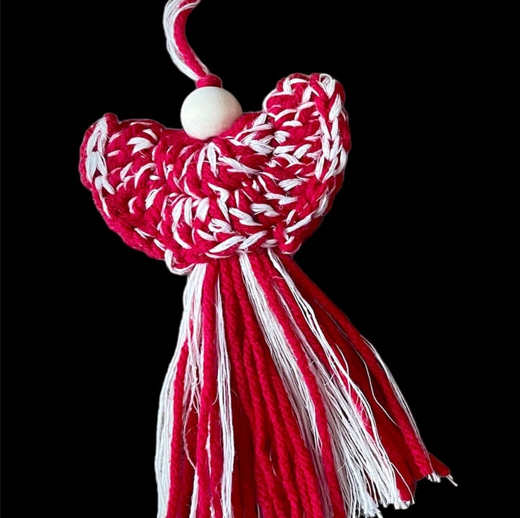 This red and natural white Angel crocheted in a combination of natural cotton yarn acrylic yarn is a perfect ornament at any time of the year, especially at Christmas.