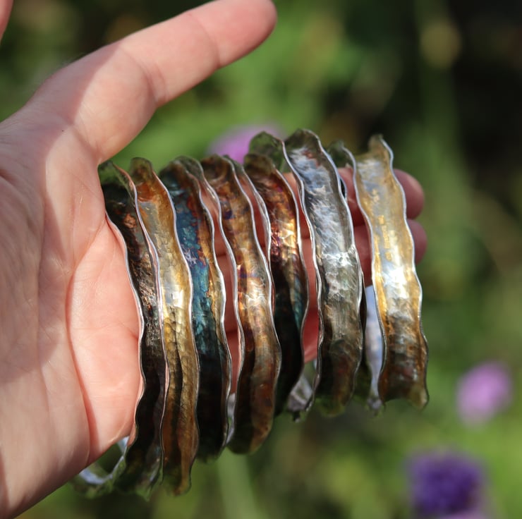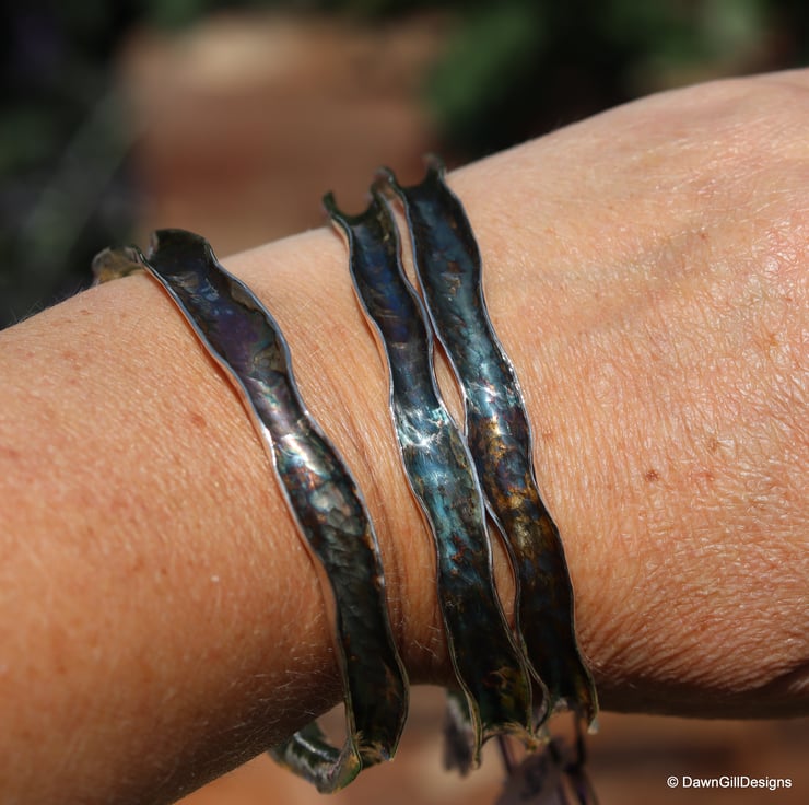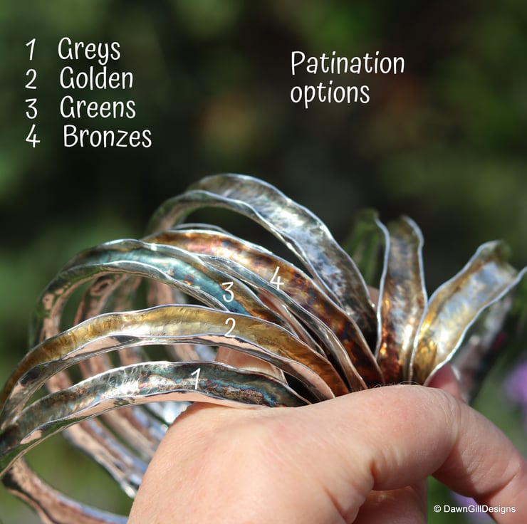 The bangles photographed are examples of golden, bronze and unpatinated. As you can see from the bunches I'm holding, I can achieve a variety of colours, including a classic deep and dark midnight.