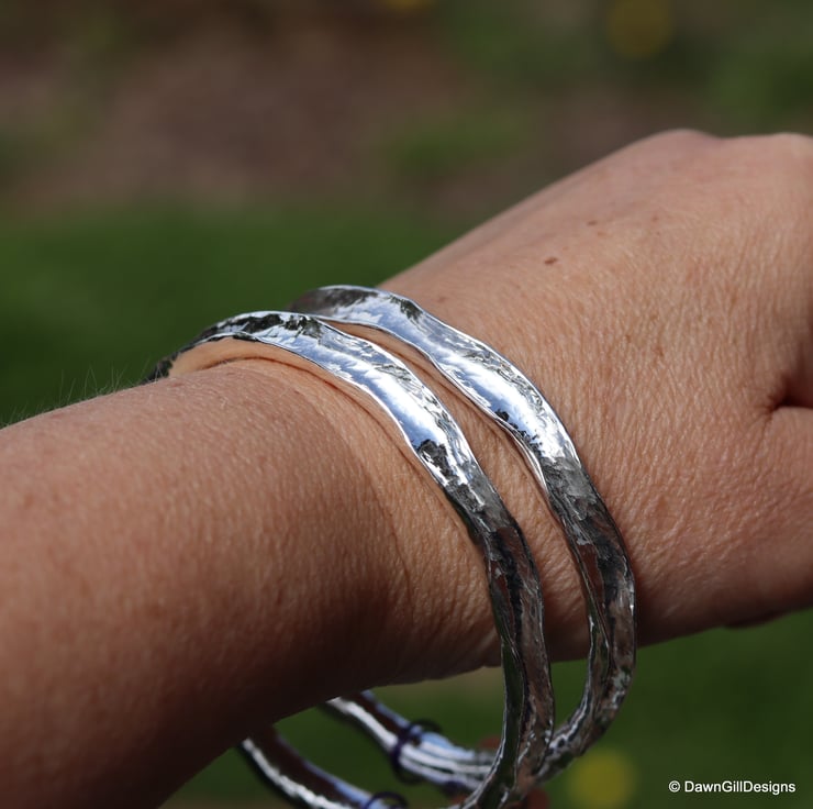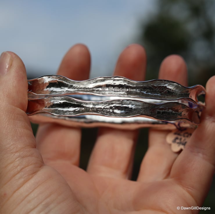 I use recycled sterling sheet to form these bangles, rolling it to a thickness of approximately 0.8mm thick, which means each is over the weight that requires formal hallmarking at the London Assay Office (ie more than 7.78g)