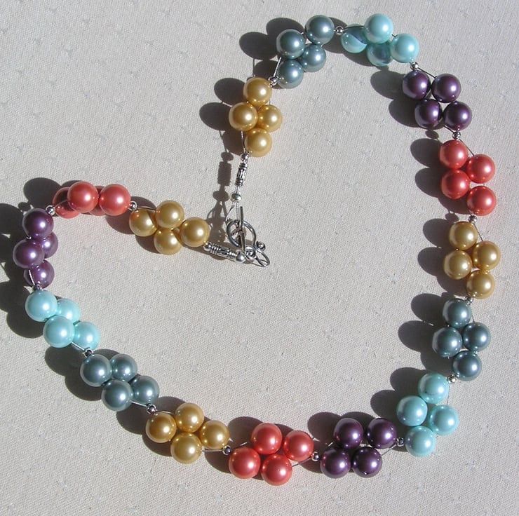 This Sumptuous Necklace is made wholly from Beautiful Shell Pearls (Shell Pearls are made from crushed shells which are then molded into shape and covered with a coloured coating), clustered together in Fours separated by a tiny Tibetan Silver spacer bead... I have designed this Necklace to be a Rainbow wave of colour using Golden, Salmon Pink, Purple, Turquoise and Green Chunky round Shell Peals which will look stunning with any outfit... either the casual look or wear it with something more Elegant for a Special Evening out