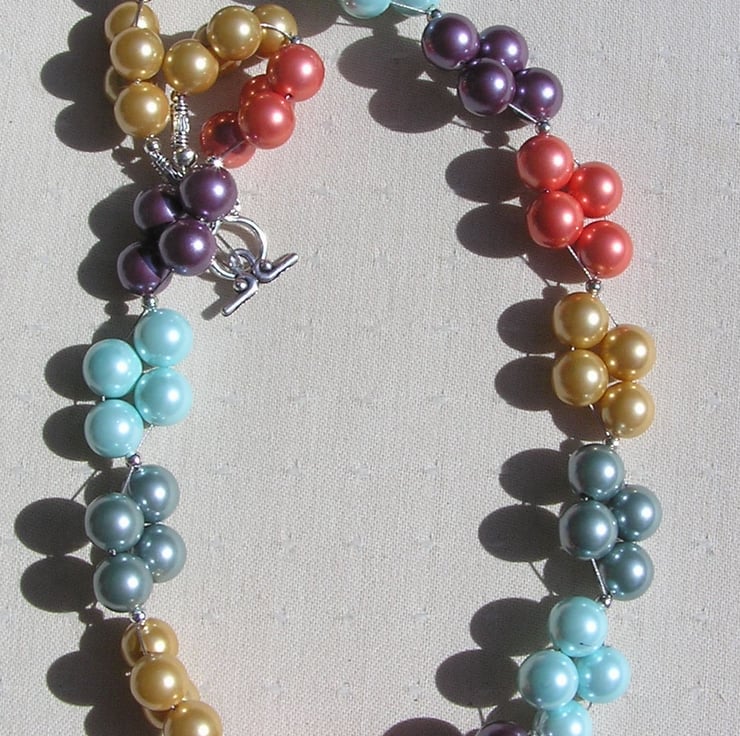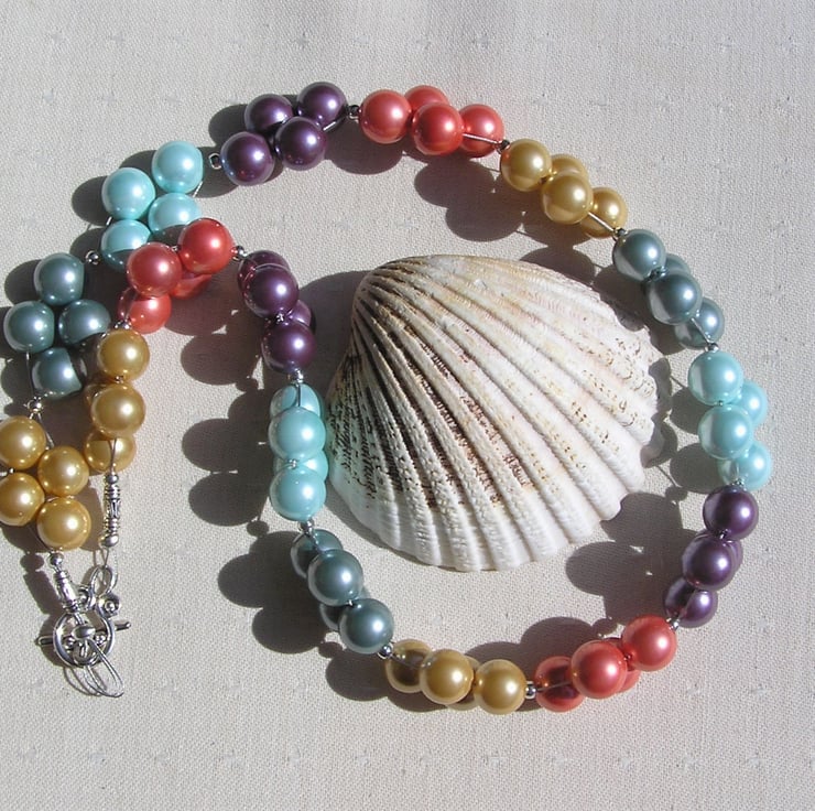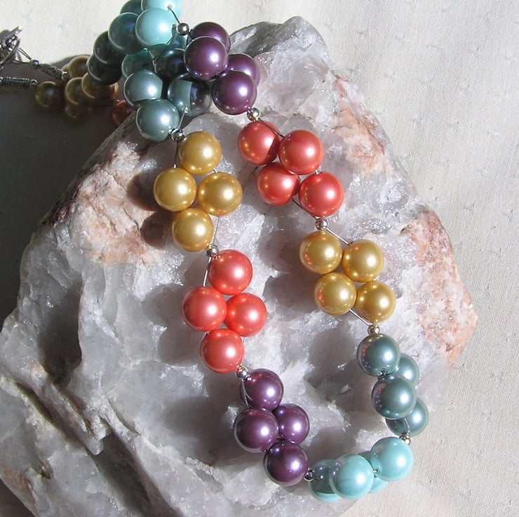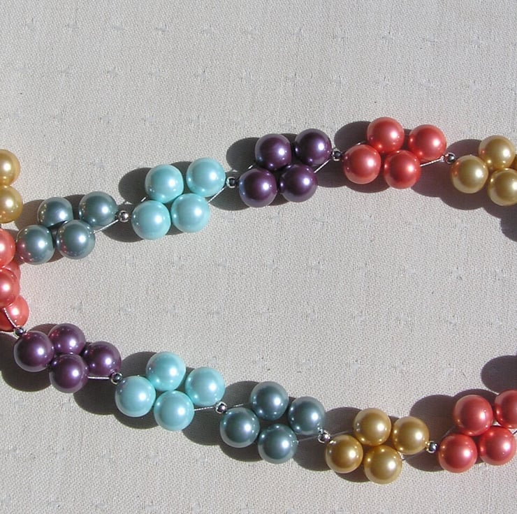 This Sumptuous Necklace is made wholly from Beautiful Shell Pearls (Shell Pearls are made from crushed shells which are then molded into shape and covered with a coloured coating), clustered together in Fours separated by a tiny Tibetan Silver spacer bead... I have designed this Necklace to be a Rainbow wave of colour using Golden, Salmon Pink, Purple, Turquoise and Green Chunky round Shell Peals which will look stunning with any outfit... either the casual look or wear it with something more Elegant for a Special Evening out