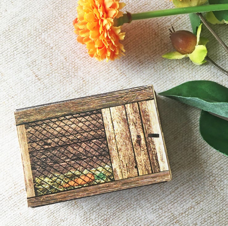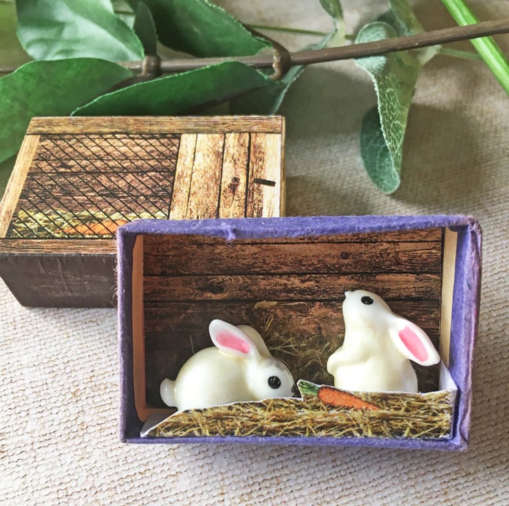 This diorama is housed inside a vintage matchbox. I've covered the top label and made the scene inside using colour paper copies backed with card. Apparently rabbits don't like to live on their own so I've added two tiny resin ones which I've painted with a very small brush!