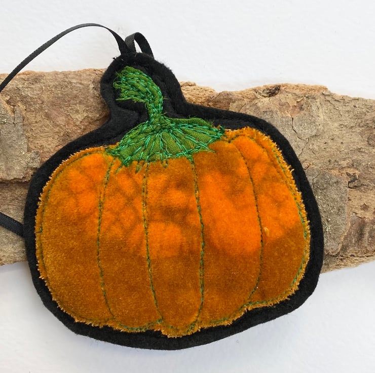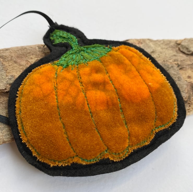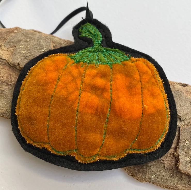 This vibrant pumpkin decoration has been made from up-cycled fabrics and stitched down with free motion embroidery. It comes felt backed and measures 8.5cm, with the matching ribbon the length is 18.5 cm approx.