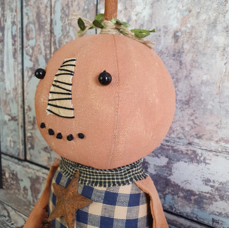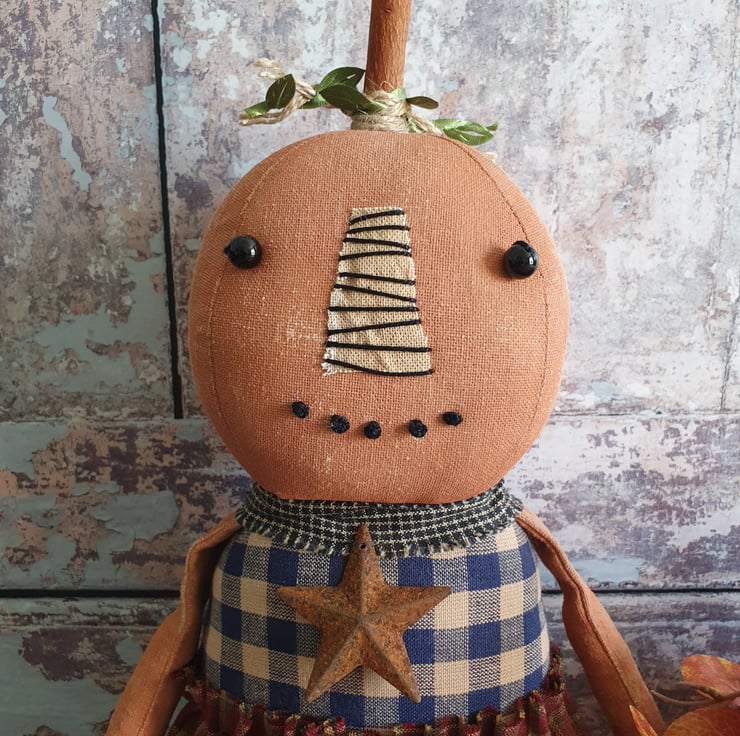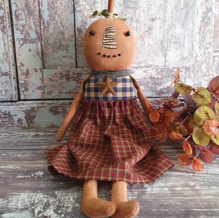 This is a large pumpkin doll made in the American Primitive style. She would make a lovely unique addition to your home for Autumn/Halloween.