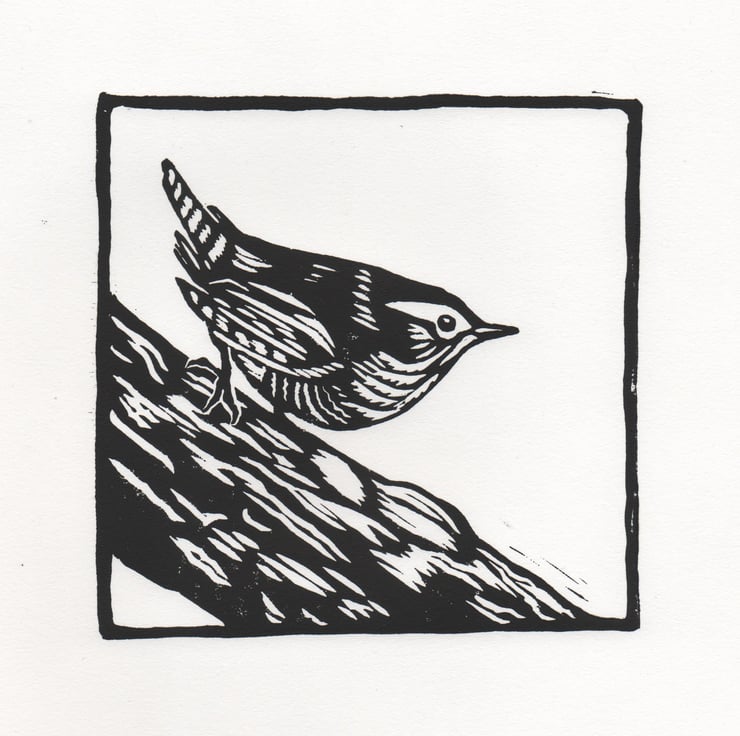 'Wren' is an original linocut print of a bold Jenny Wren, one of our smallest yet loudest British birds, handprinted in rich black ink.