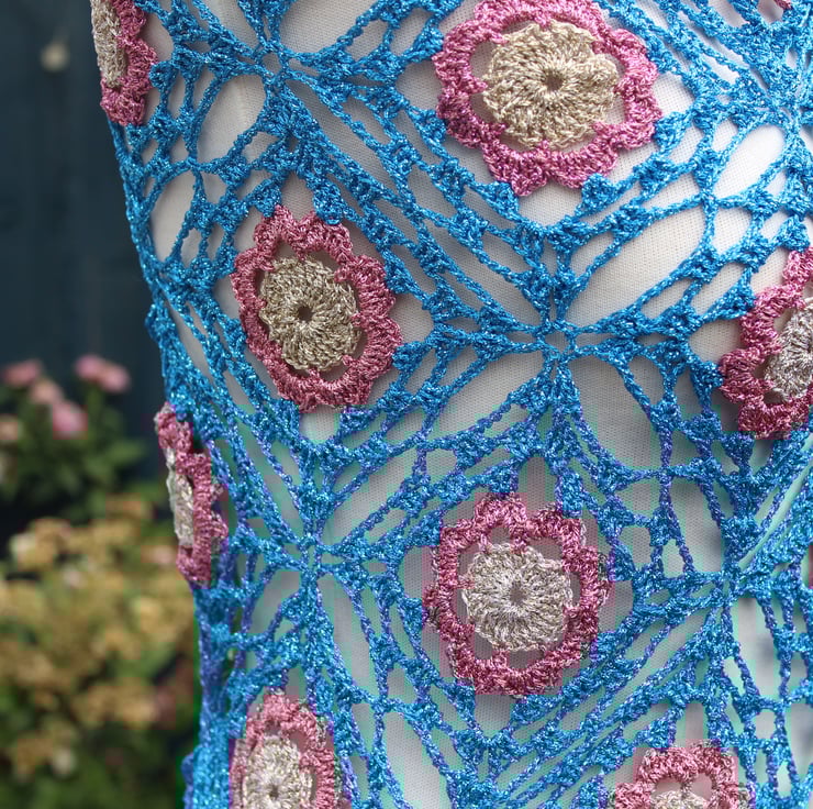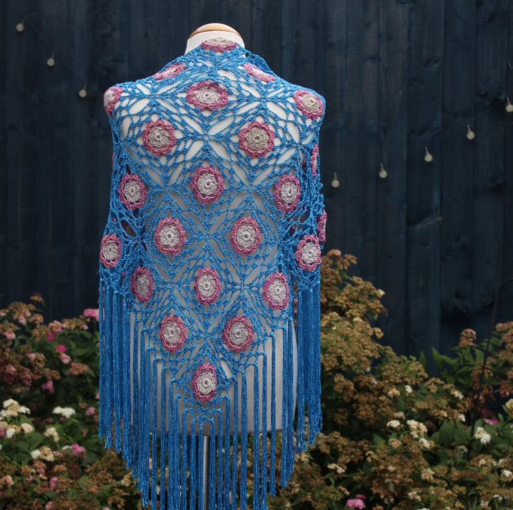 Crochet triangular shawl in sparkly gold, pink, kingfisher blue - design LF433