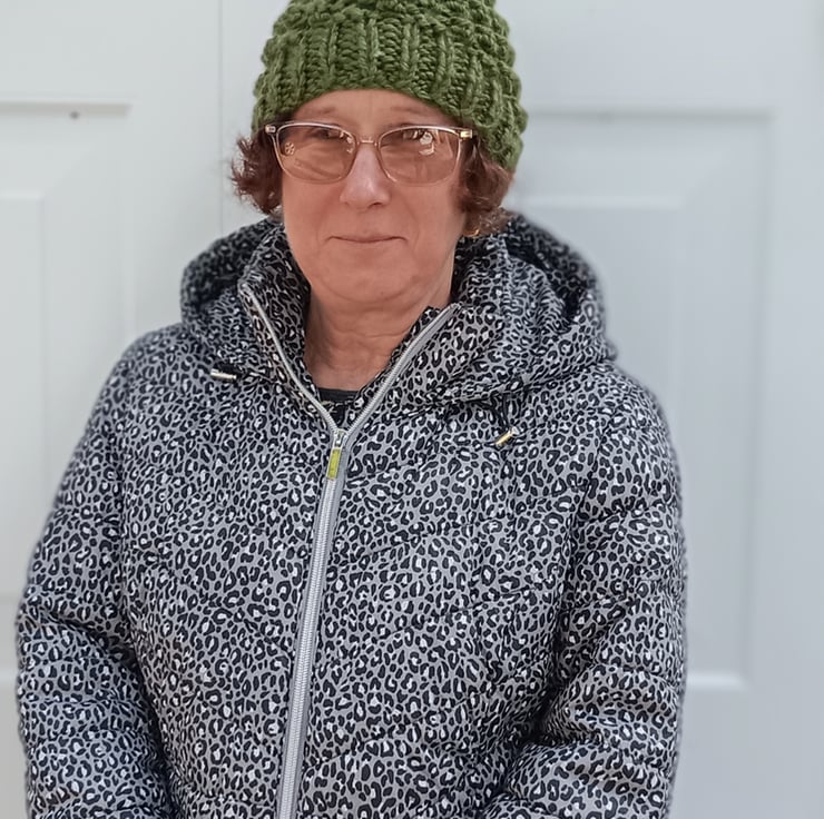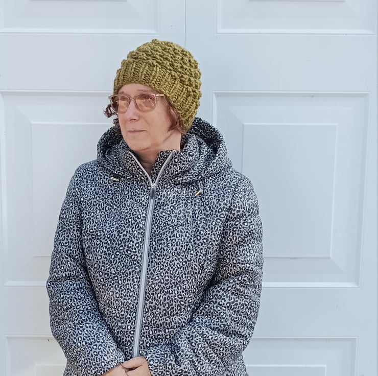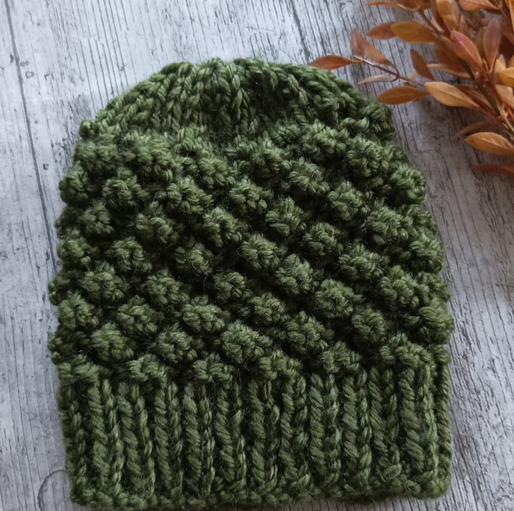 Knitted in a bobble stitch with stretchy ribbed band.