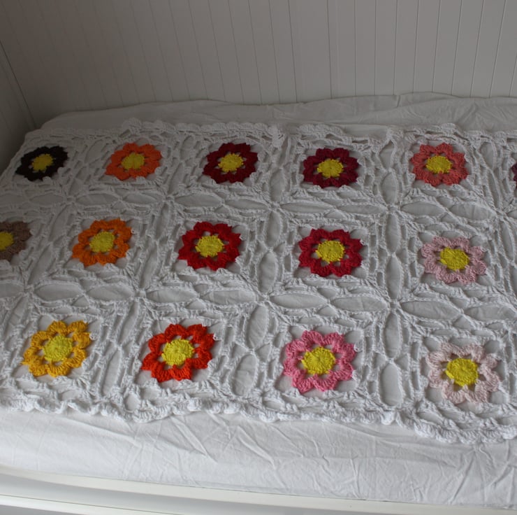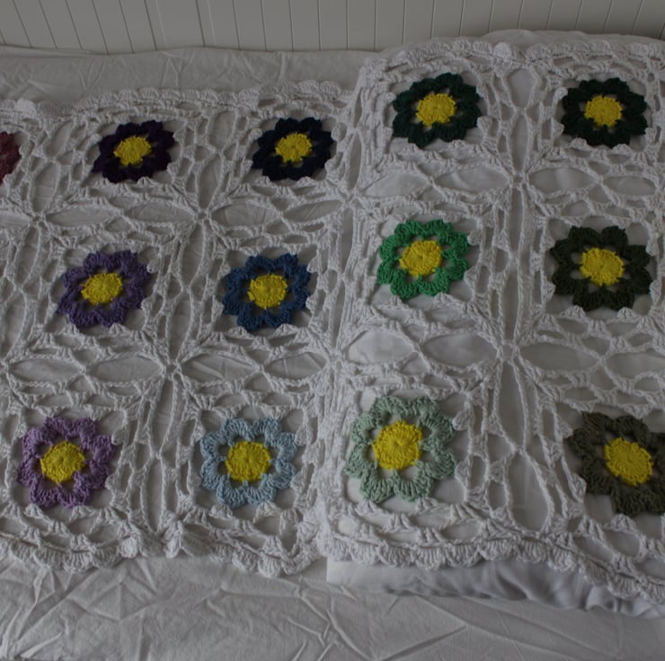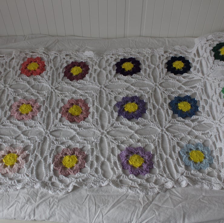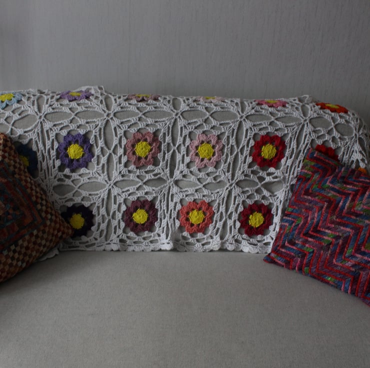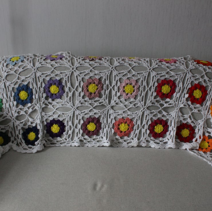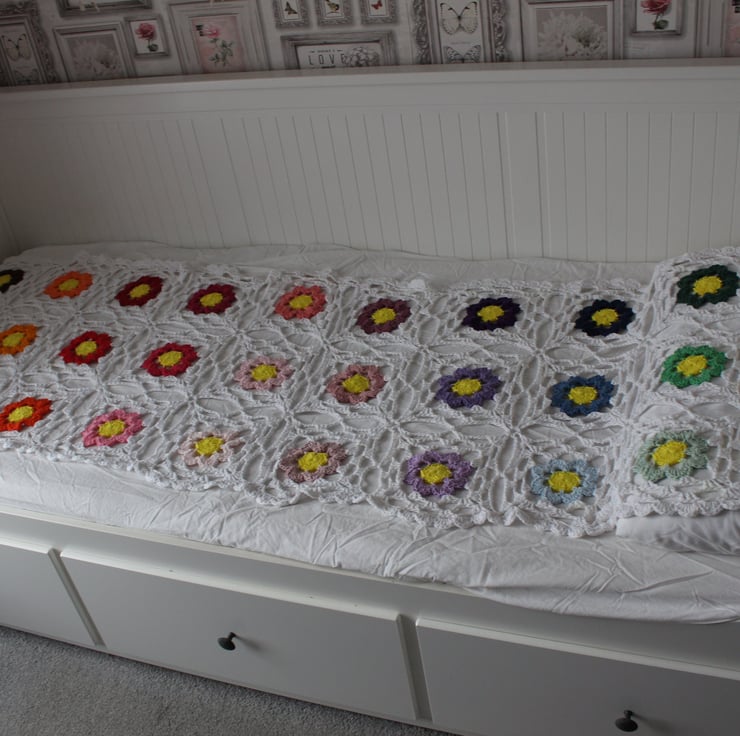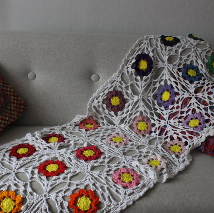 This long, narrow throw is a unique creation of mine, crocheted using high-quality 100% cotton yarn in an inspiring palette of thirty-two vibrant colours, complemented by crisp white to harmonise the design. The flowers are arranged in a rainbow pattern along the length, featuring darker, medium and light shades across the three rows.