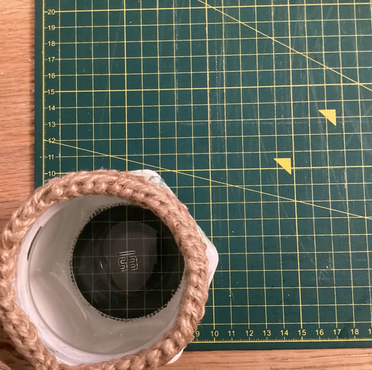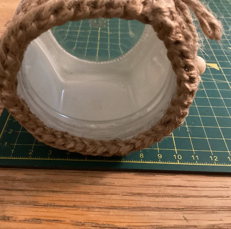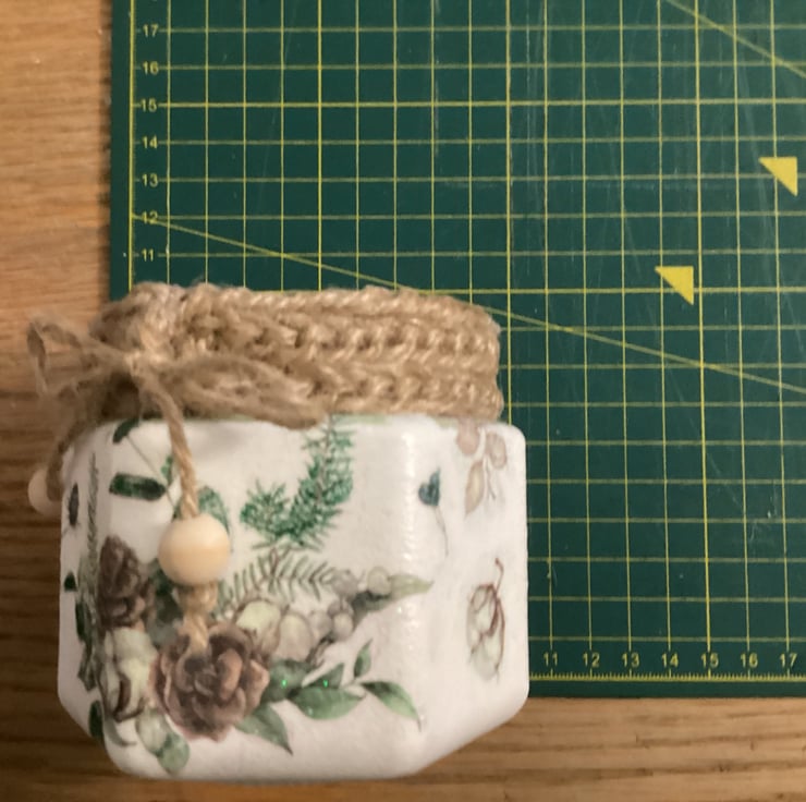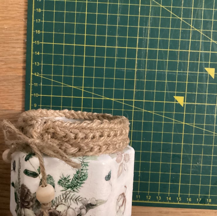 To decorate it I’ve crochet jute cord and place it around jar with a bow and wooden beads.