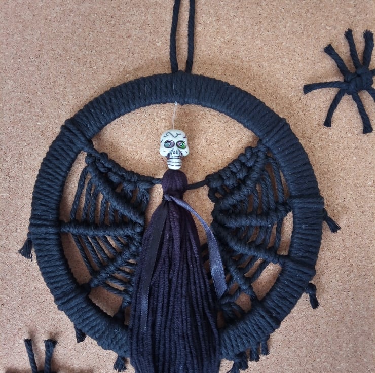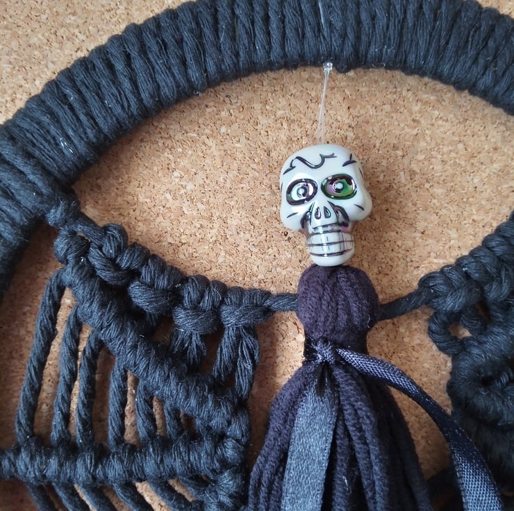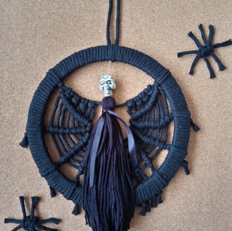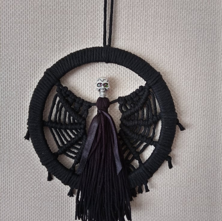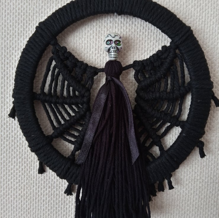 Spooky Dark Angel with skull for Halloween. Wings made to look like a spider web. The 6.5" wooden (MDF) frame is wrapped in soft black macrame cord, the body is made of soft baby cotton and an acrylic bead with multicolour effect. Great for Halloween as a wall decor or even a door hanging (but preferably indoors).