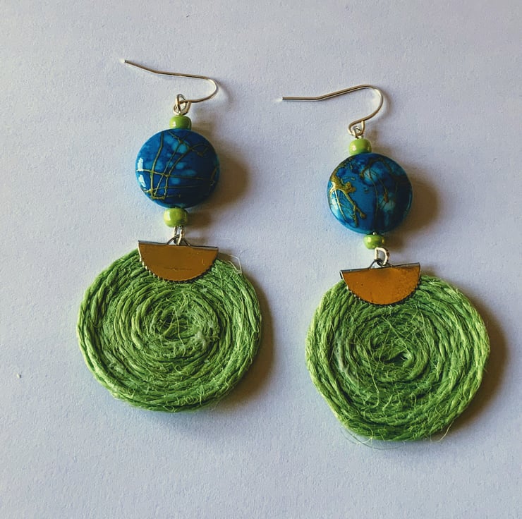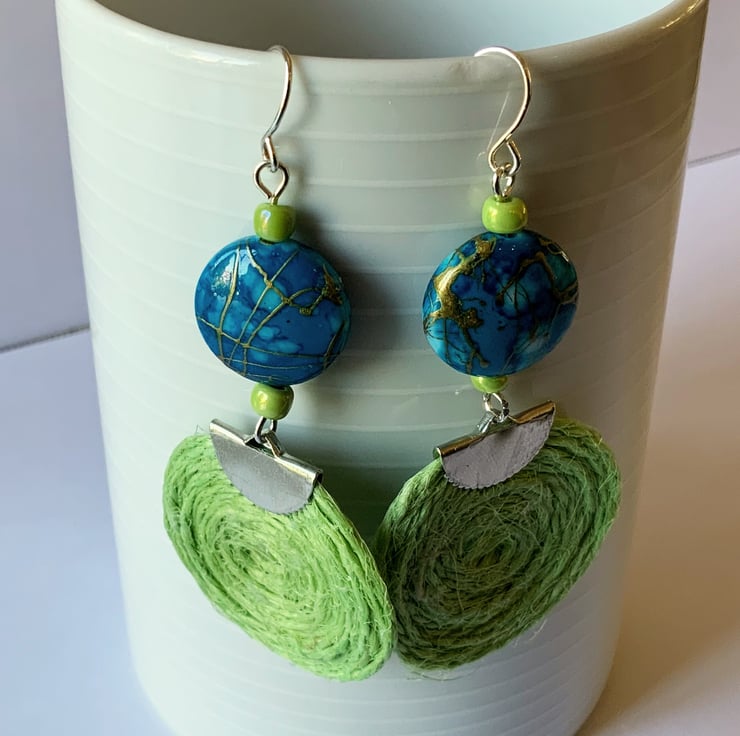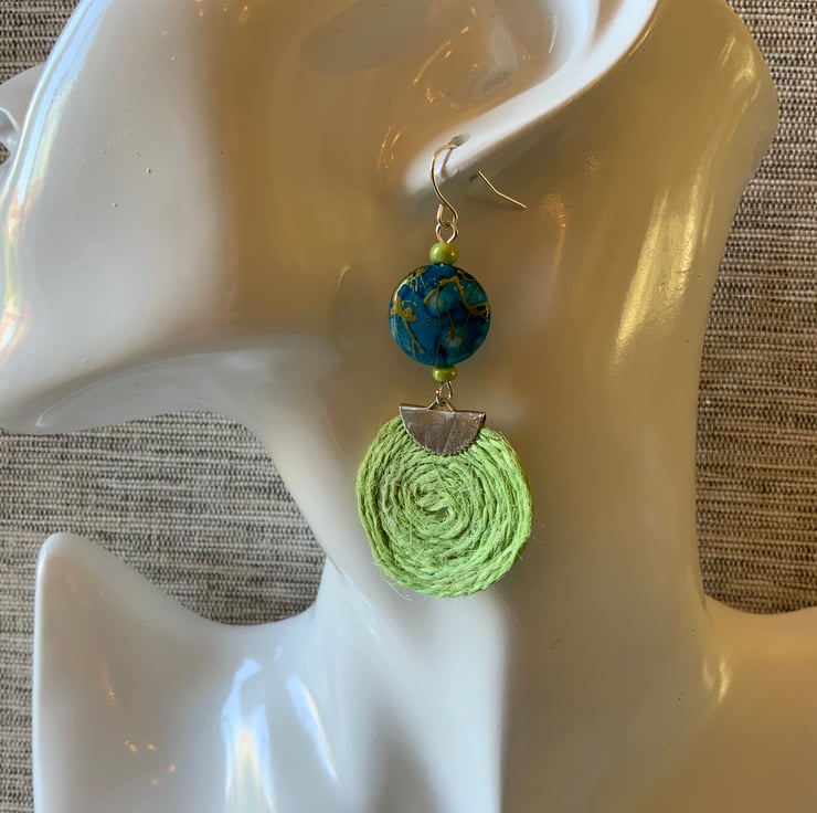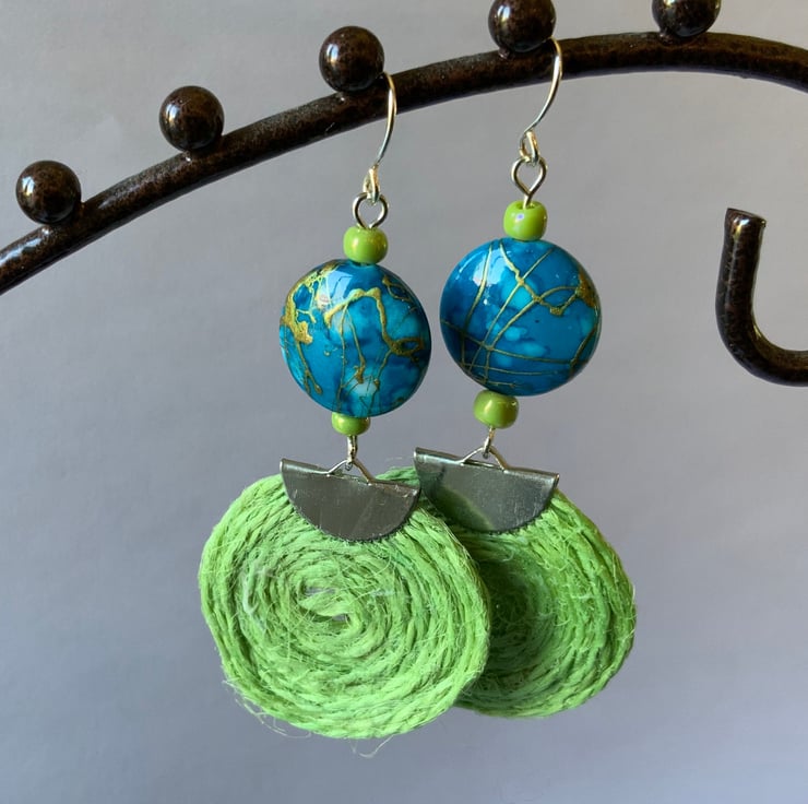 Featuring teal blue marble beads with gold splash effect.Matching lime green mini rochells match the vibrant lime green hemp spirals. On silver plated ear wires.