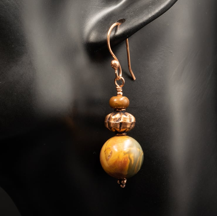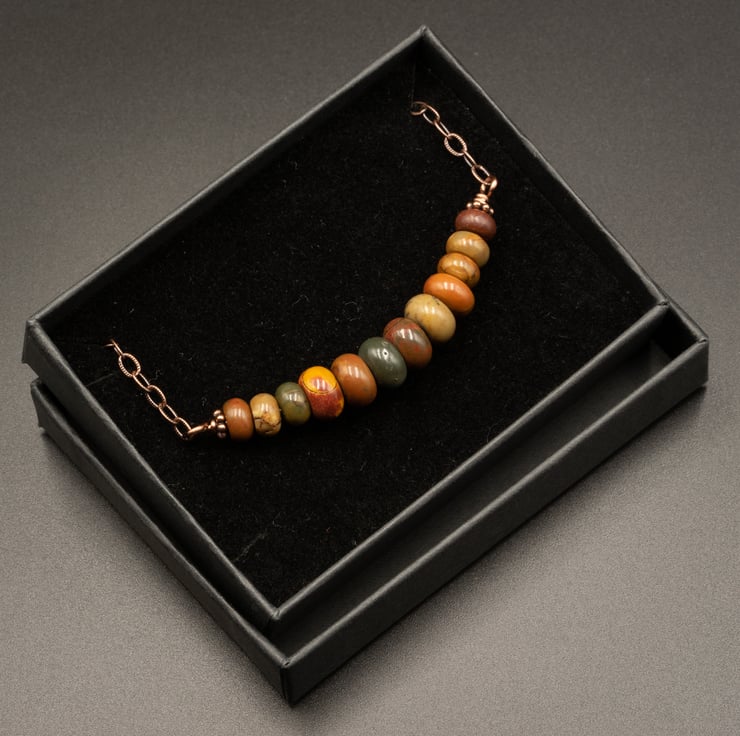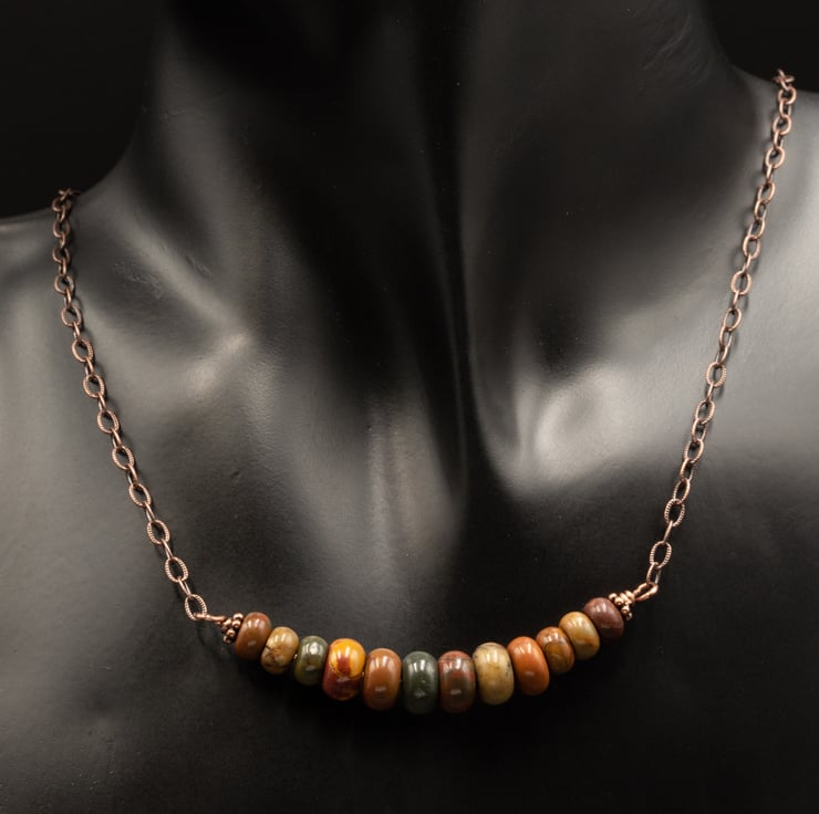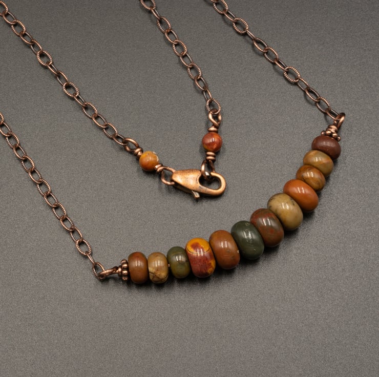 8mm and 6mm rondelle beads of earthy Picasso jasper are hand wrapped onto copper plated wire to create this pretty necklace. The central beaded bar measures 2.5 inches / 63mm long and the fine quality etched copper plated chain is finished with matching picasso jasper 4mm beads, a handmade copper plated loop and a copper plated lobster clasp.