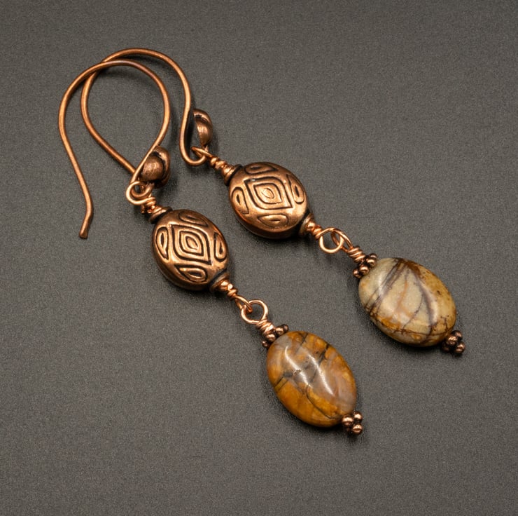 6m round beads of earthy picasso jasper are hand wrapped onto individual links of pure copper wire to create this dainty bracelet. Lovely marking on these stones.