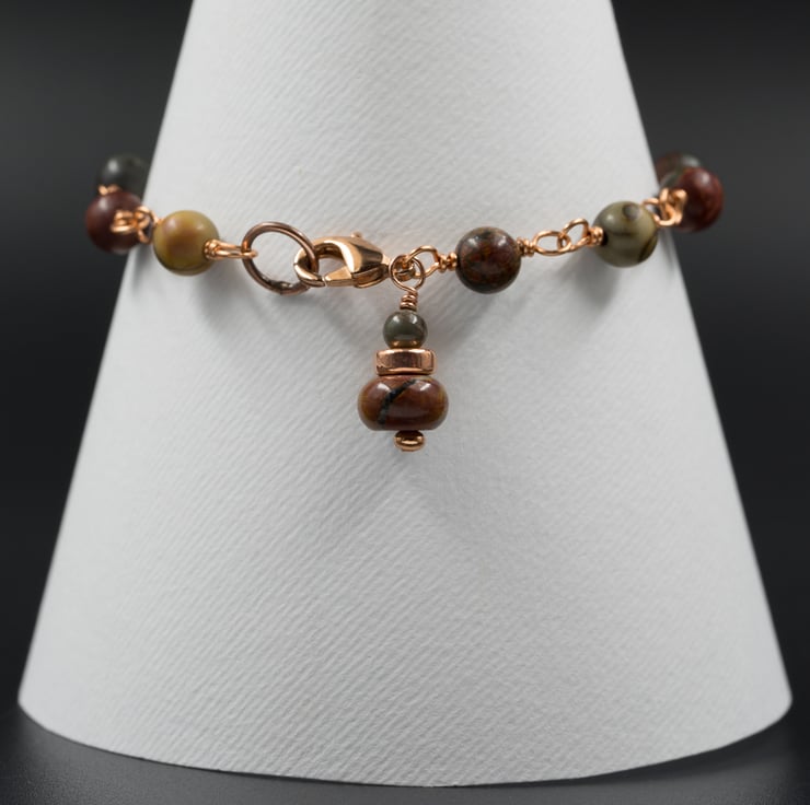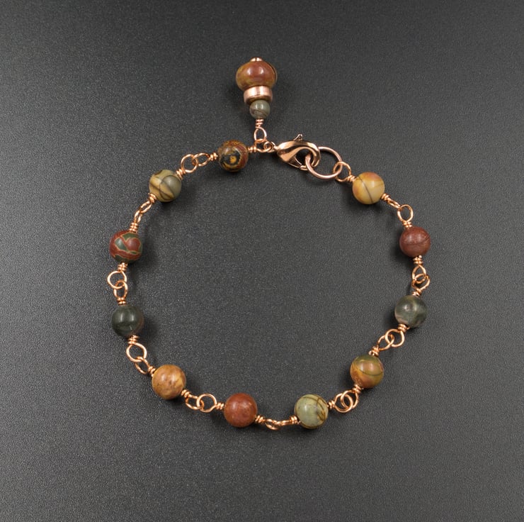 The bracelet closes with a copper lobster clasp and ring , the design is completed with a matching picasso jasper charm.