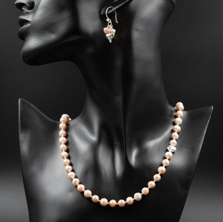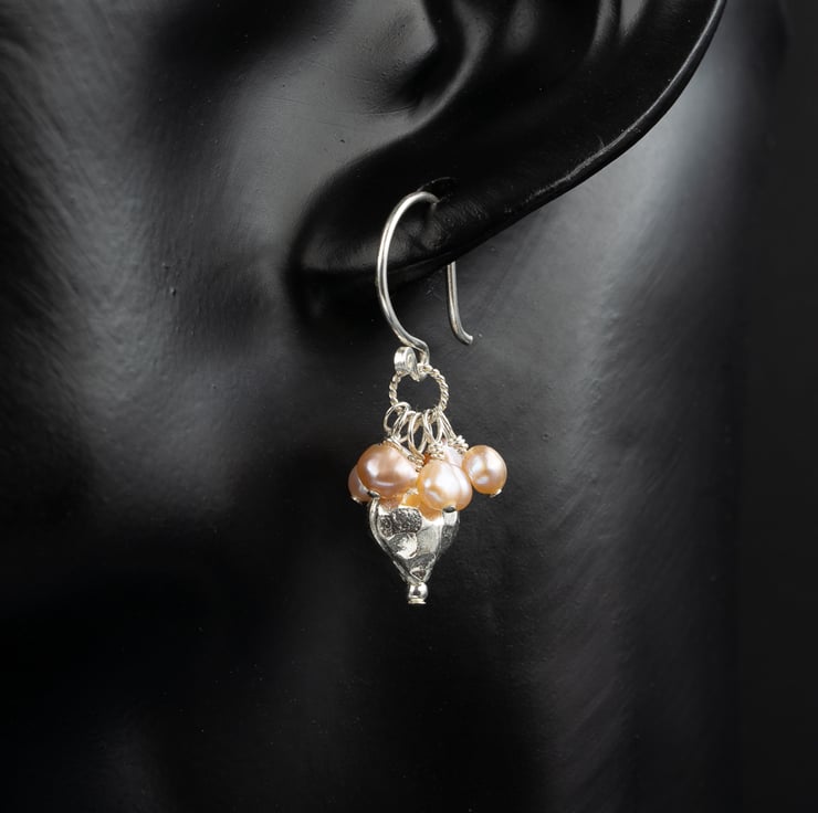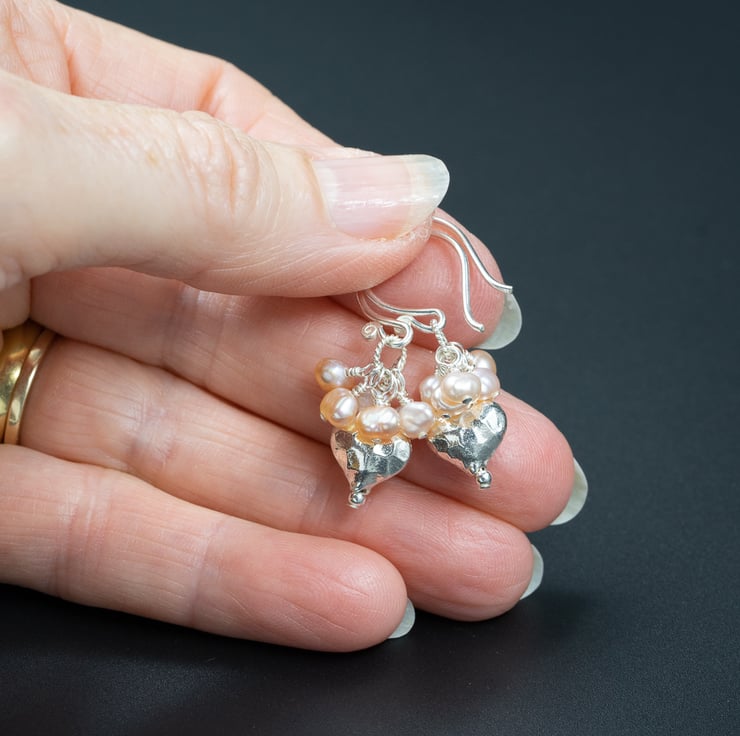 Beautiful natural pale pink 4.5mm freshwater pearls hang in a cluster above a hammered Karen Hill tribe silver heart.