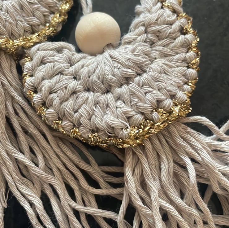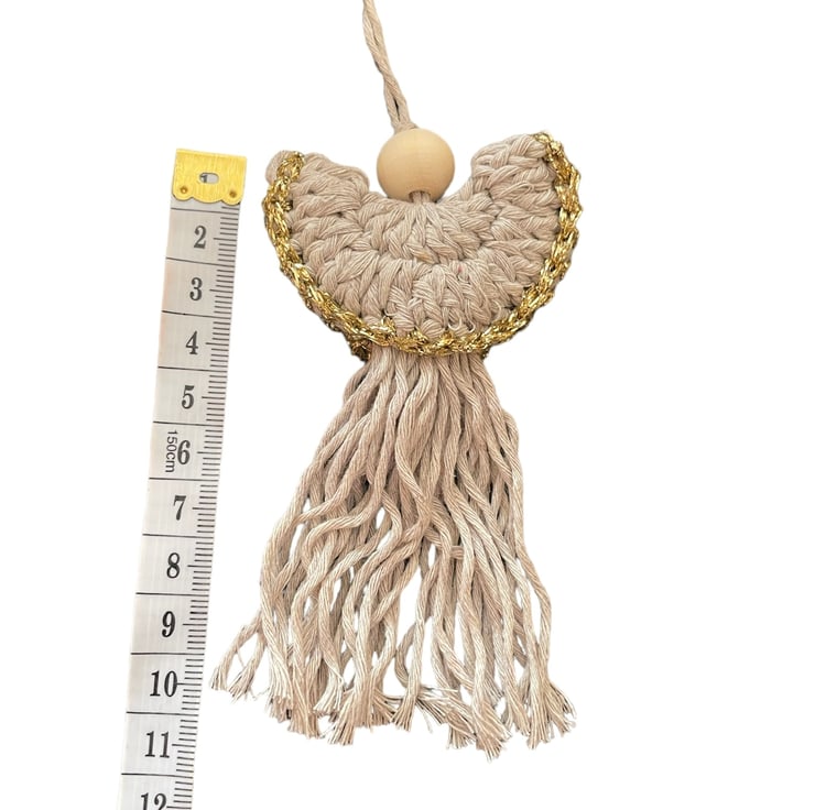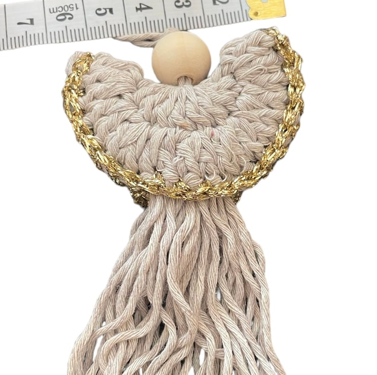 Each angel is handcrafted in cotton yarn with a gold polyamide yarn trim and wooden bead. Each angel measures approximately 6 cm x 11 cm.