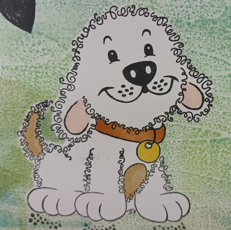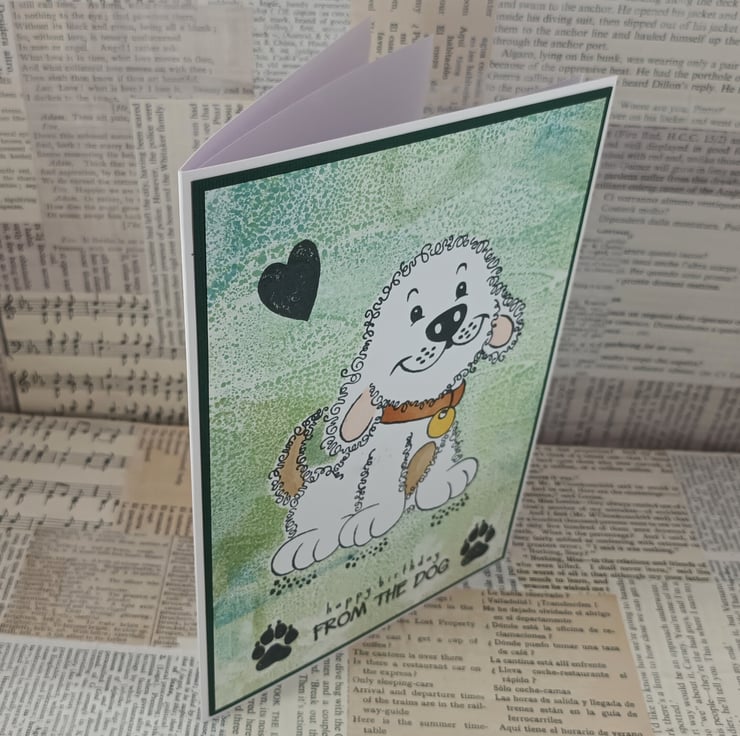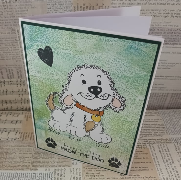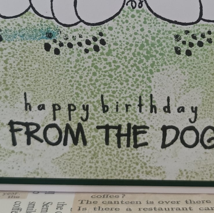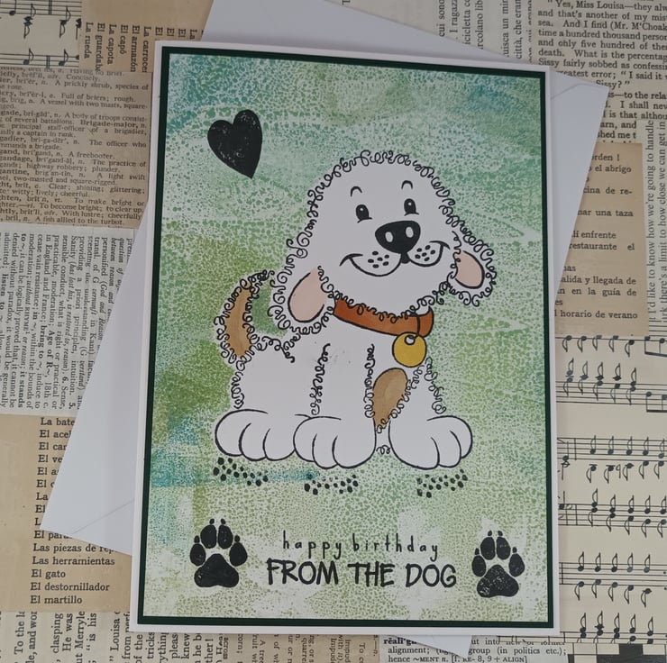 Birthday card perfect for dog parents or family members. The card features a cute stamped image of a dog with a background created from mixed green/blue distress inks. The sentiment reads: 'happy birthday FROM THE DOG' and there are stamped pawprints and a heart.