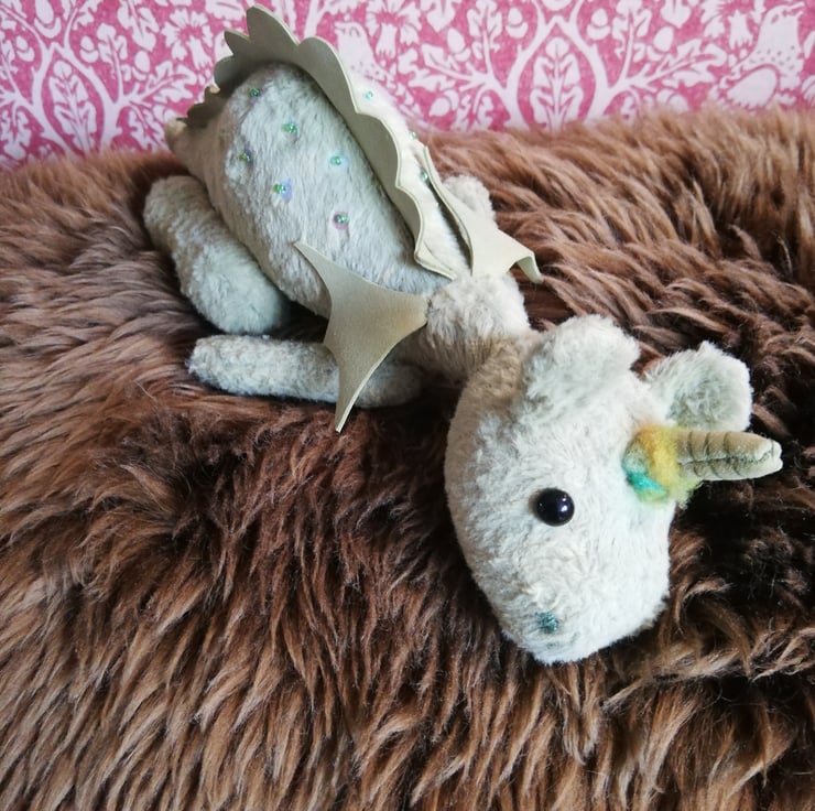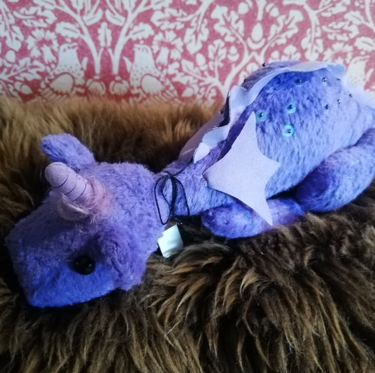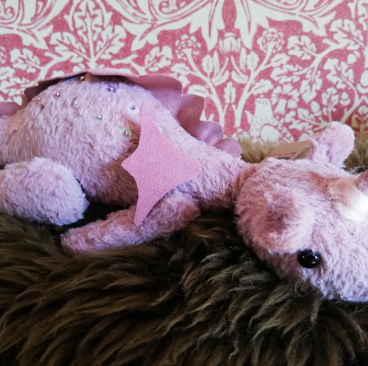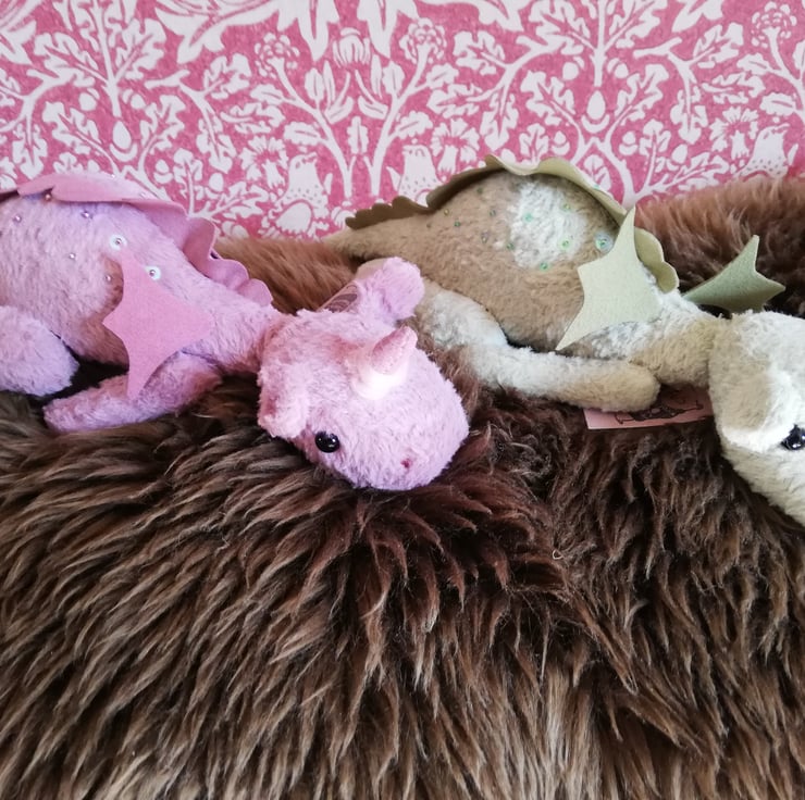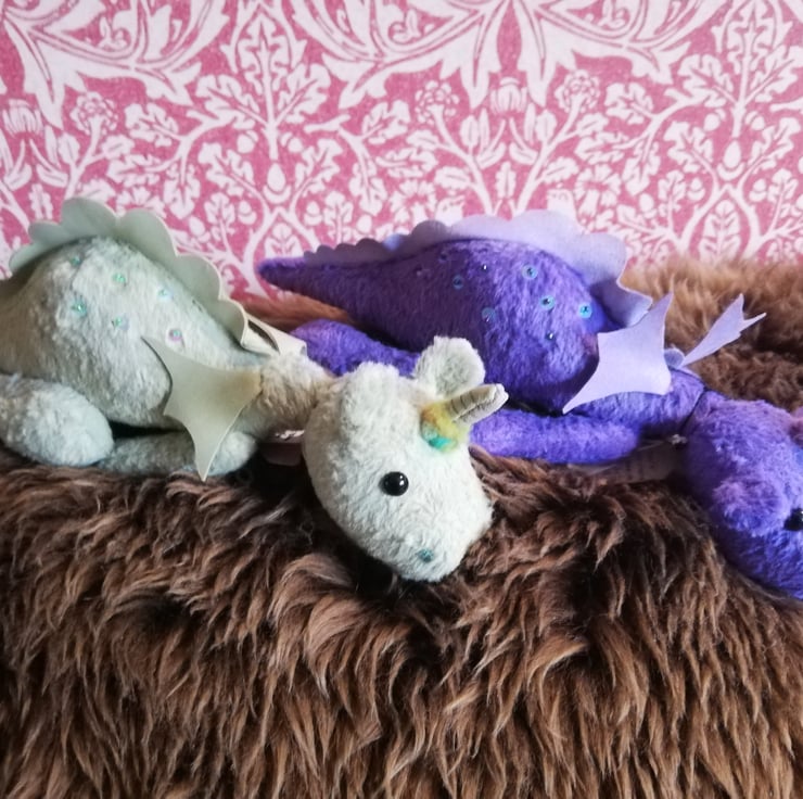 A selection of quirky, hand sewn, fully jointed dragons. Dozing happily, dreaming of golden hoards! Made in a soft green, Raspberry Pink or Purple viscose fabric with ultrasuede features.This is not a toy! Collectors item only!please choose from the selection of pink, purple or green when ordering and if a preference of green ones, ask for either the one with the pink or the one with the purple.