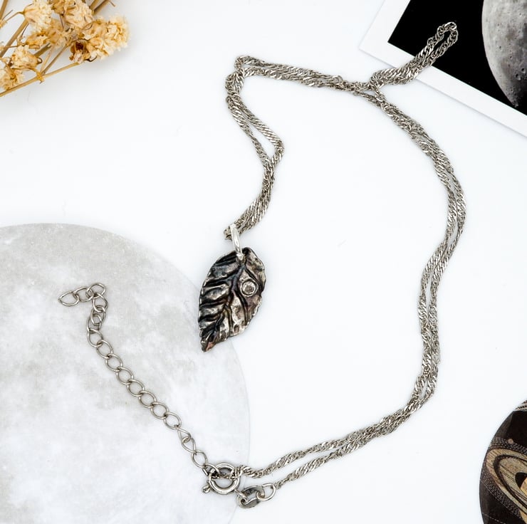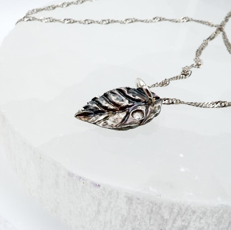 Crafted from solid fine recycled silver, the delicate blackberry leaf charm captures the intricate details of nature's beauty. A dainty diamond white cubic zirconia gemstone has been set in the pendant, adding a beautiful bit of sparkle!