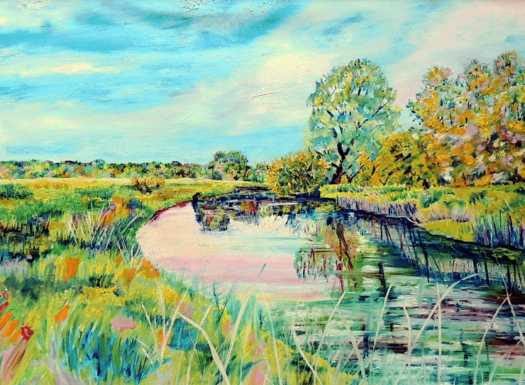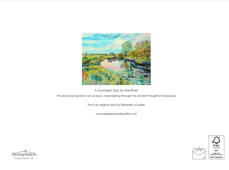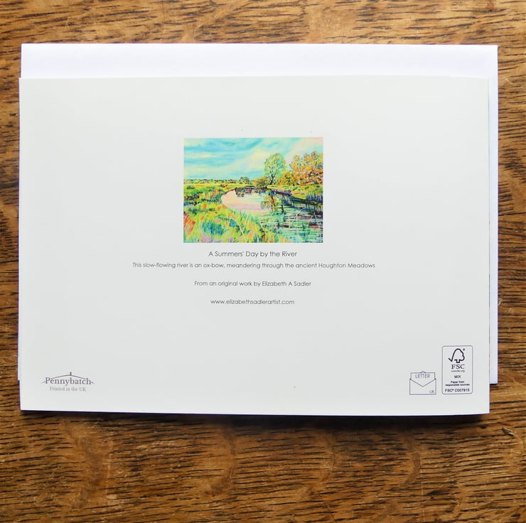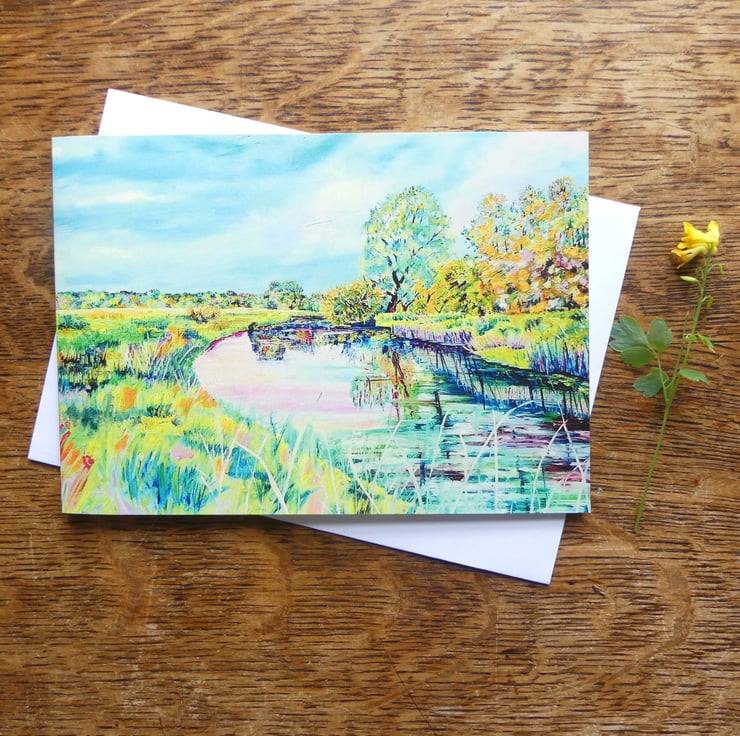 A5 Landscape blank fine art greeting card 148.5 x 210mm printed on FSC semi-gloss paper produced from an image taken from my original oil painting of a river meandering through summer meadows in Cambridgeshire