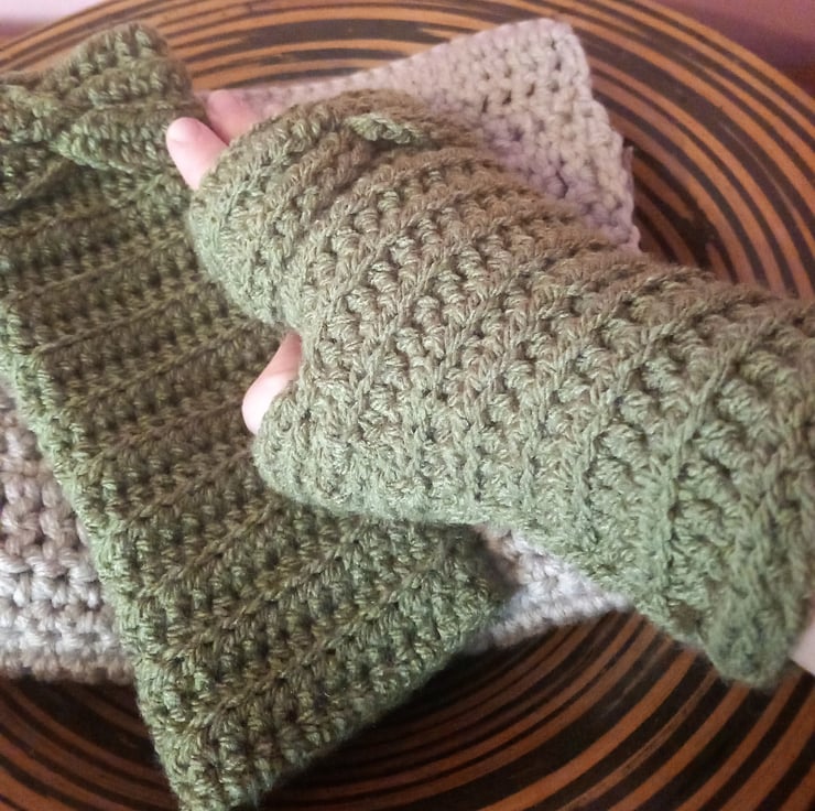 My handcrafted fingerless gloves are for the modern woman who values both warmth and functionality. Crocheted with care from a lovely moss green aran weight yarn, they'll keep your hands cozy and comfortable during your outdoor adventures. Crafted with a light ribbed crochet stitch, these gloves offer just the right amount of stretch for a fabulous fit.