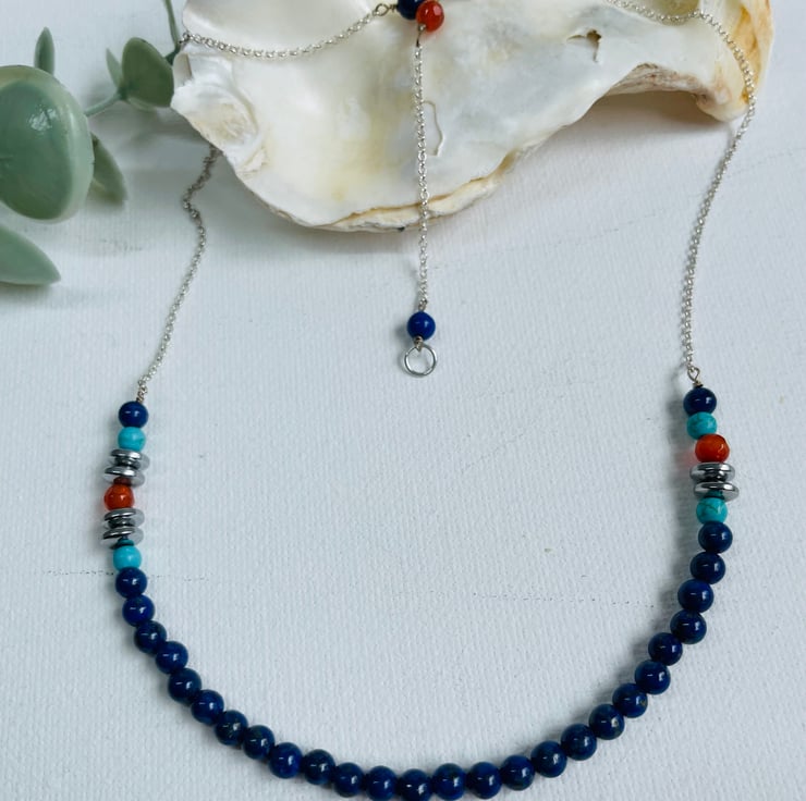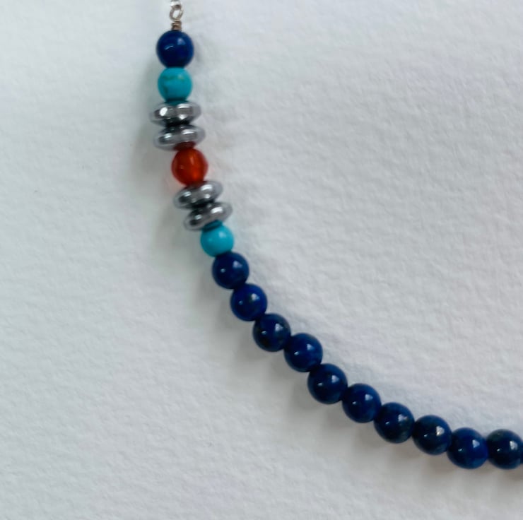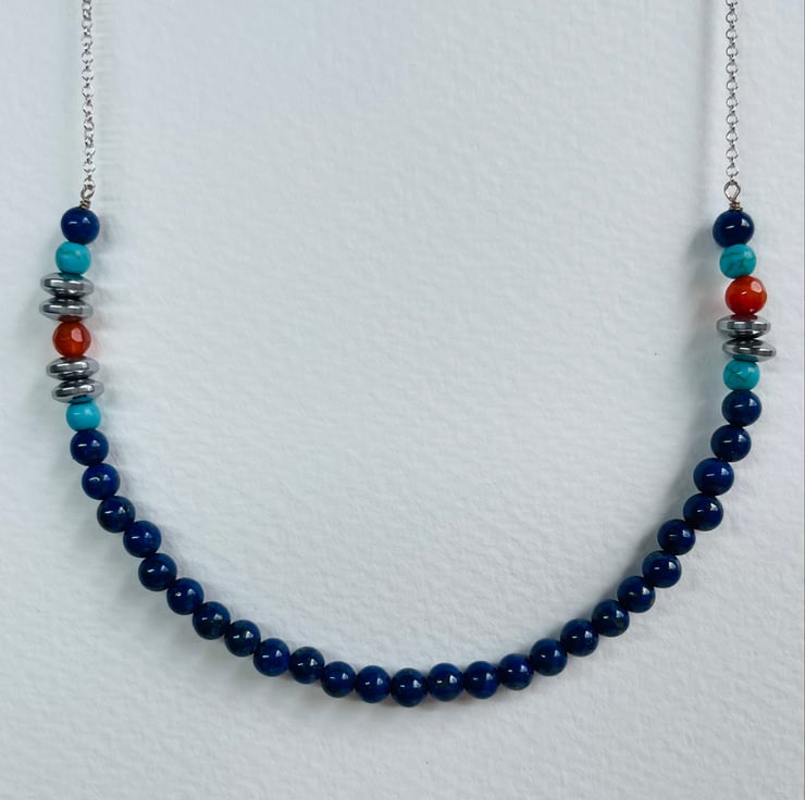 Sterling silver chain with 4mm gorgeous blue lapis lazuli, and sections of turquoise howlite, carnelian and silver plated hematite gemstones beads.