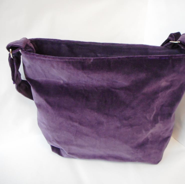 Luxurious velvet shoulder bag with adjustable cross body strap. This is a soft, unstructured bag in purple velvet.