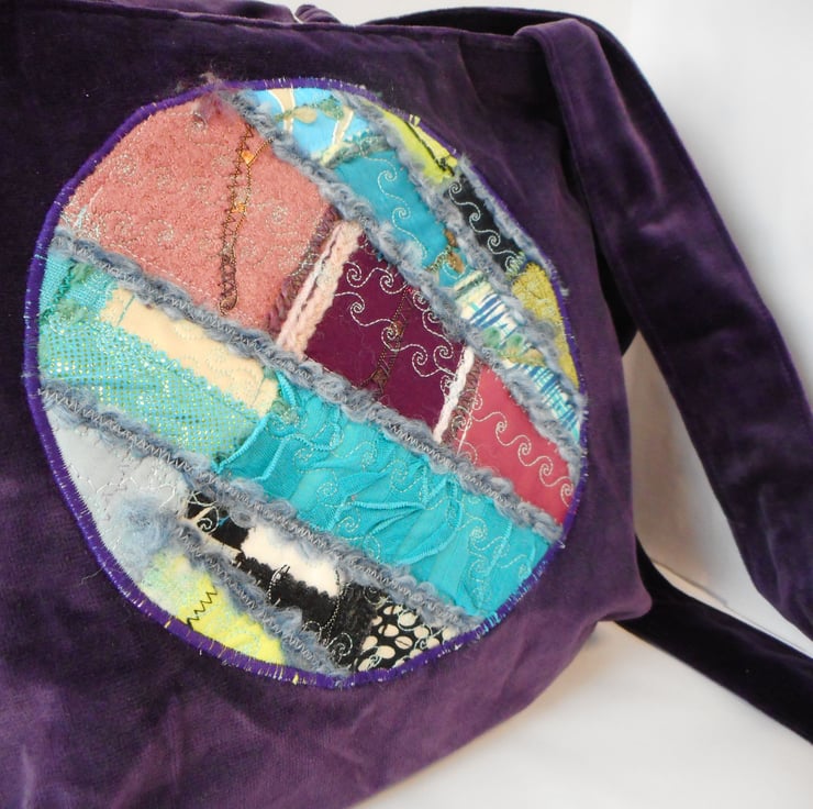 The main fabric is a furnishing fabric offcut. The front of the bag has been embellished with an appliqued panel made from a variety of mixed textiles and machine embroidery.