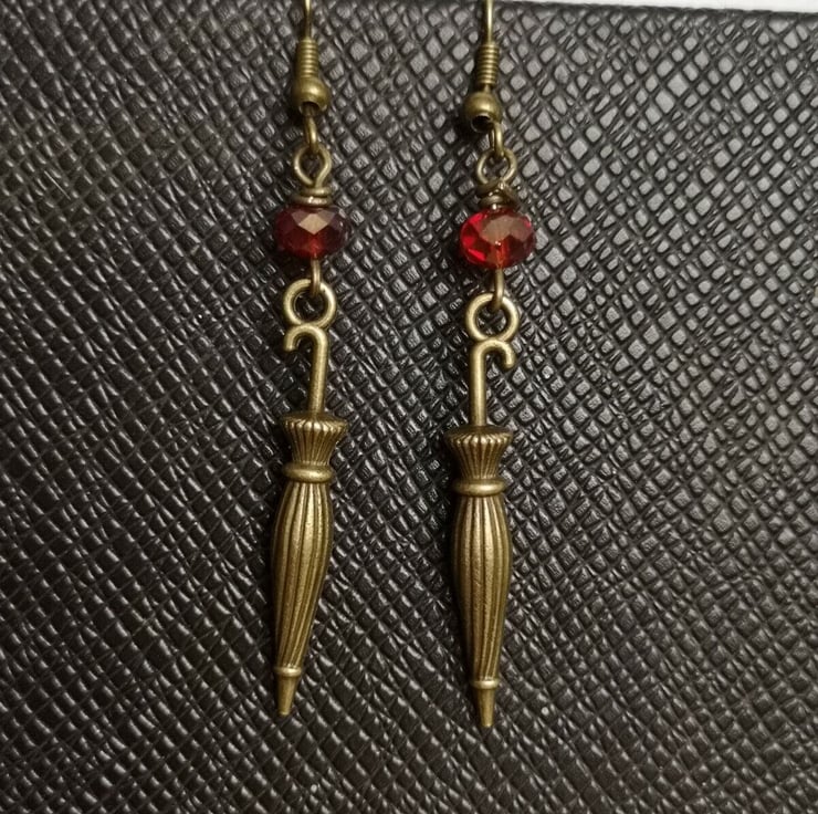 Steampunk Theme umbrella charm drop earrings red glass beaded kitsch dangle