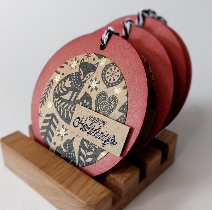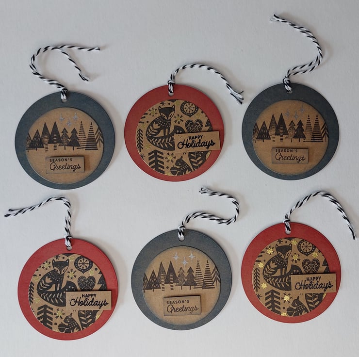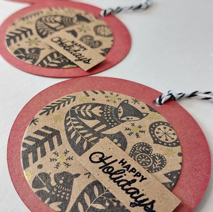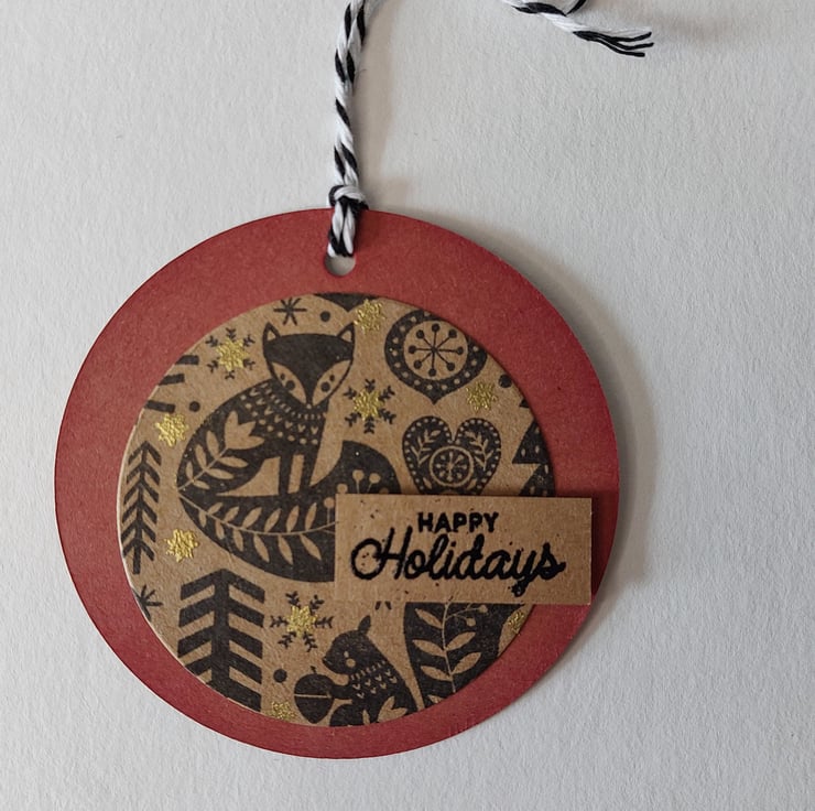 Set of 6 round Christmas gift tags - Nordic Fox design with gold embossing and 3D detailing.