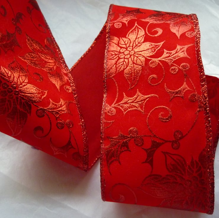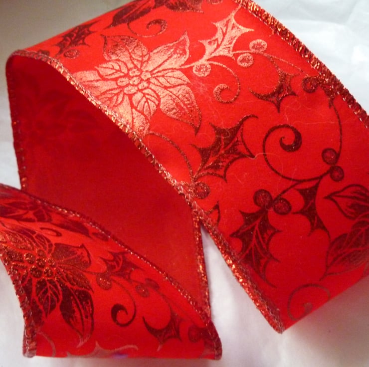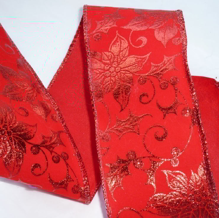 1 Metre Wire Edged Christmas Ribbon 63mm Red Velvet Shine Poinsettia