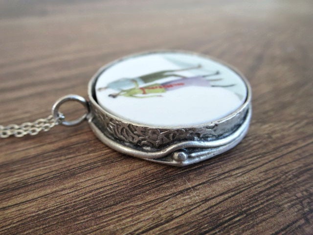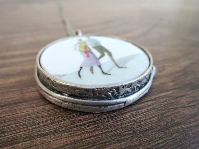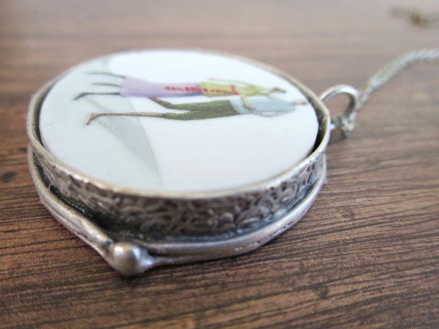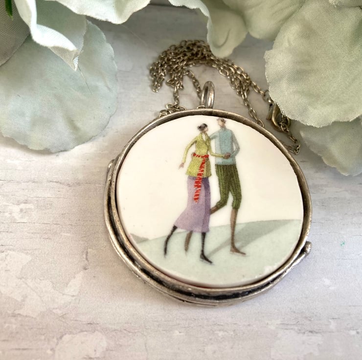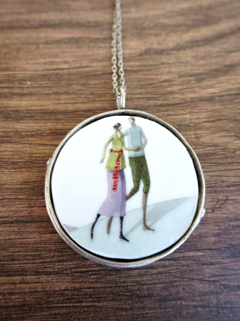 This large festive handmade broken china pendant necklace has been crafted using a Christmas Winter pattern ceramic plate featuring a couple ice skating from the Portmeirion 'A Fine Romance' range. Carefully set in an antiqued silver plated mount with an antiqued silver plated 17.5-inch curb chain.