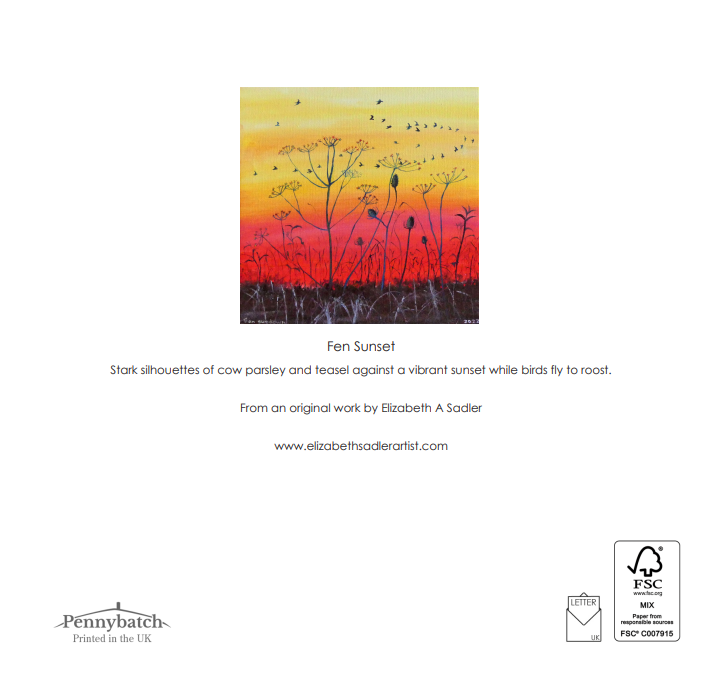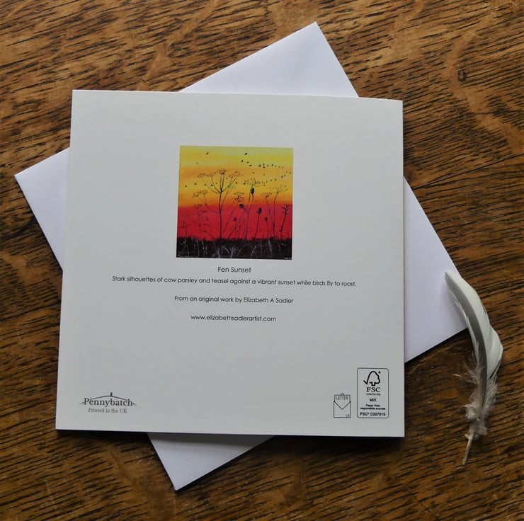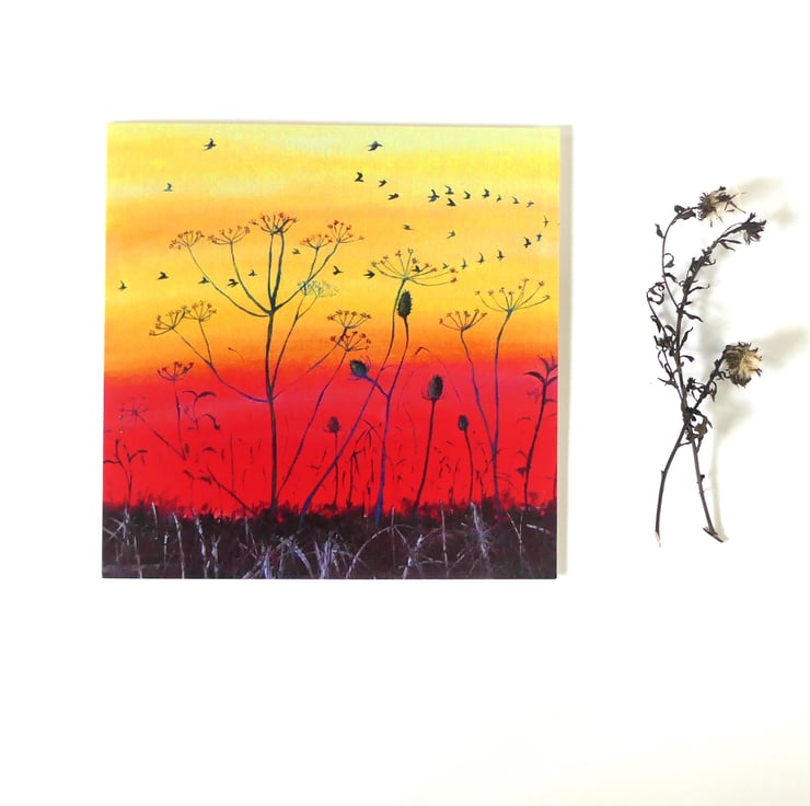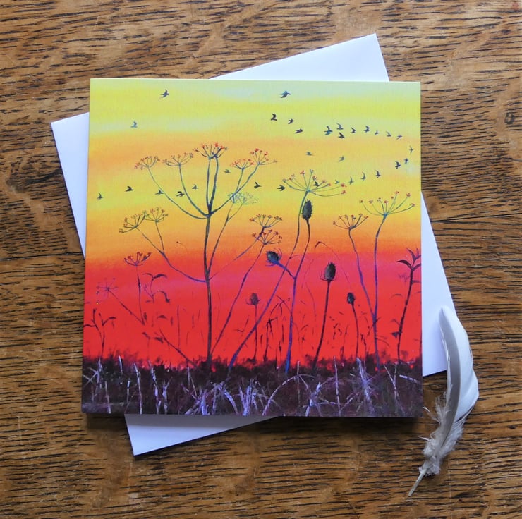 150 x 150 mm square blank fine art greeting card printed on FSC semi-gloss paper produced from an image taken from my original oil landscape painting of teasels and cow parsley silhouetted against a summer sunset as birds fly to roost