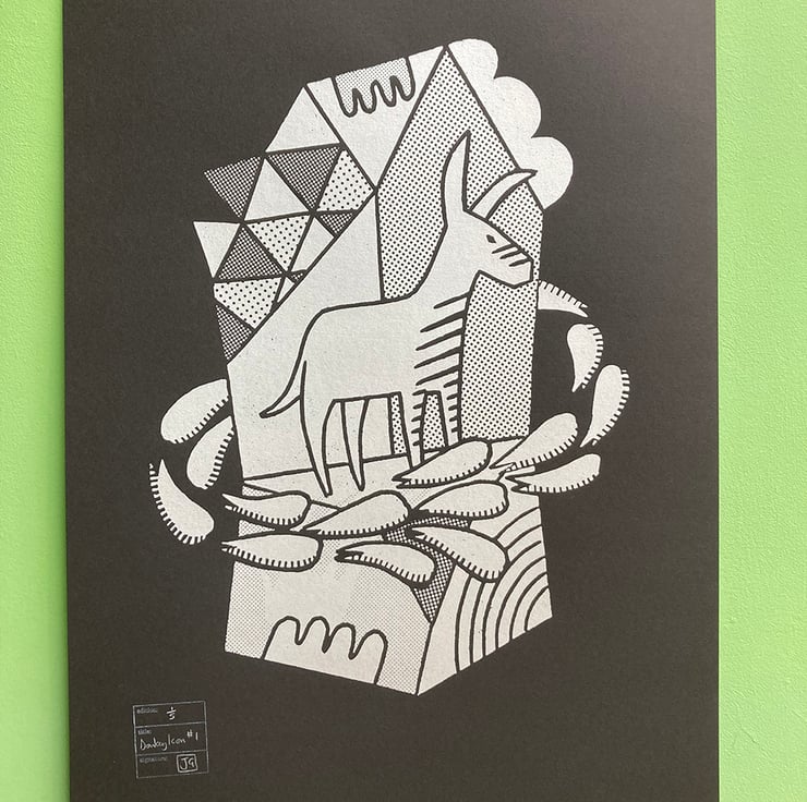 Silver Aqua Art ink on recycled black Seawhite 280gsm acid-free paper. From an edition of only 5, signed, stamped, titled and numbered. The print started out as a linocut. I then added the halftones (spotty bits), before printing the edition as a screen-print.