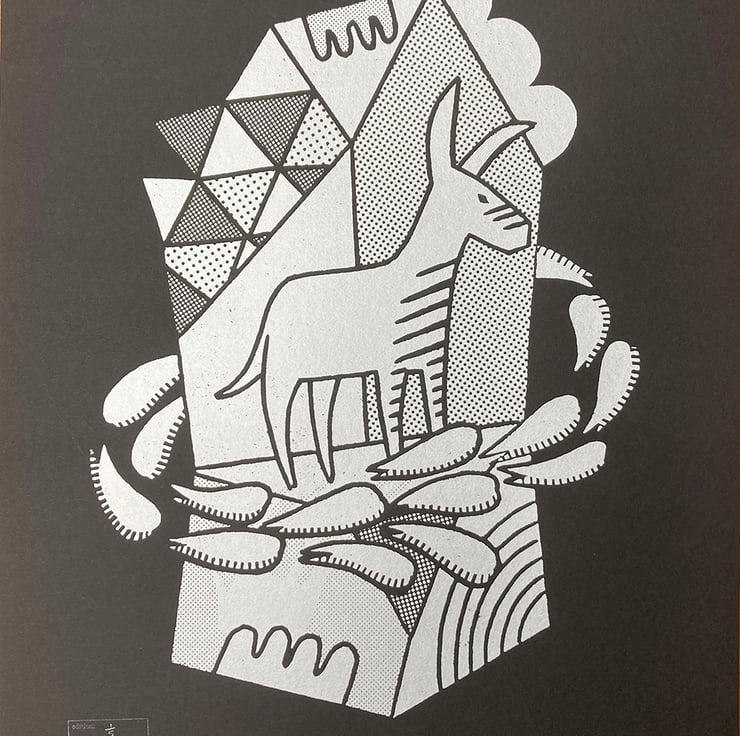 This is a hand-pulled linocut / screen-print entitled 'Donkey Icon No.1' printed with silver ink on black paper.