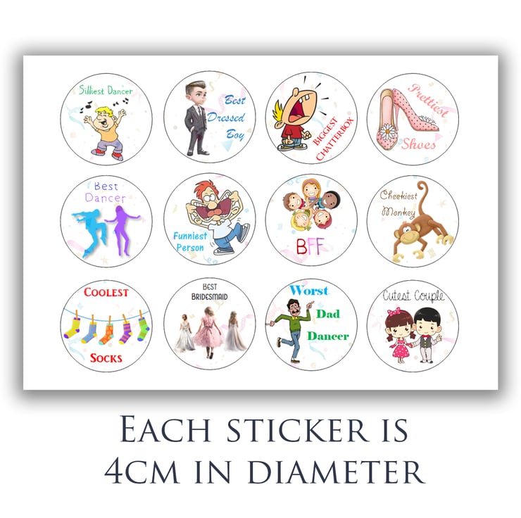 Additionally, each pack includes 12 wedding award stickers, measuring 4cm in diameter. These stickers are re-peelable for all-day and night fun and excitement.